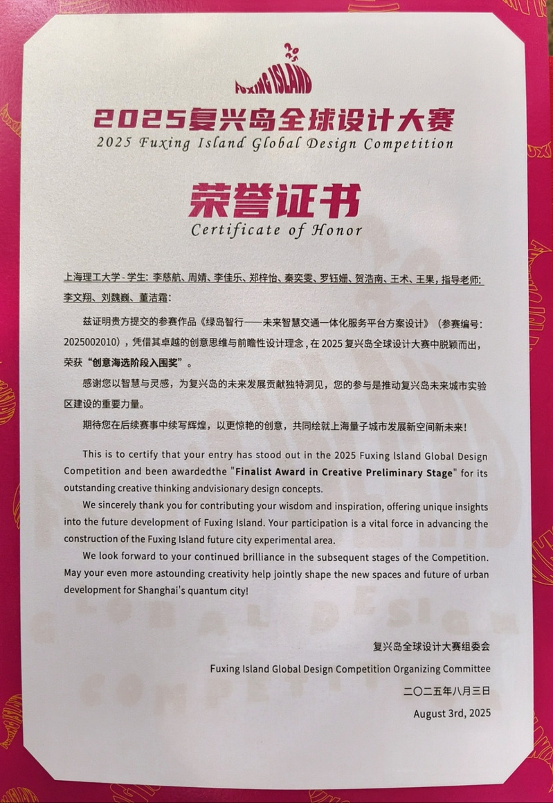 8月3日,9001cc金沙以诚为本管理学院收到复兴岛全球设计大赛组委会颁发的2025复兴岛全球设计大赛荣誉证书。由管理学院副院长刘魏巍、交通系统工程系教师李文翔和董洁霜联合指导的参赛作品《绿岛智行——未来智慧交通一体化服务平台方案设计》,经过校内选拔赛、大赛组委会评审等多个环节,从全球600余份创新提案中脱颖而出,获“创意海选阶段入围奖”,成为仅有的40支晋级复赛团队之一。