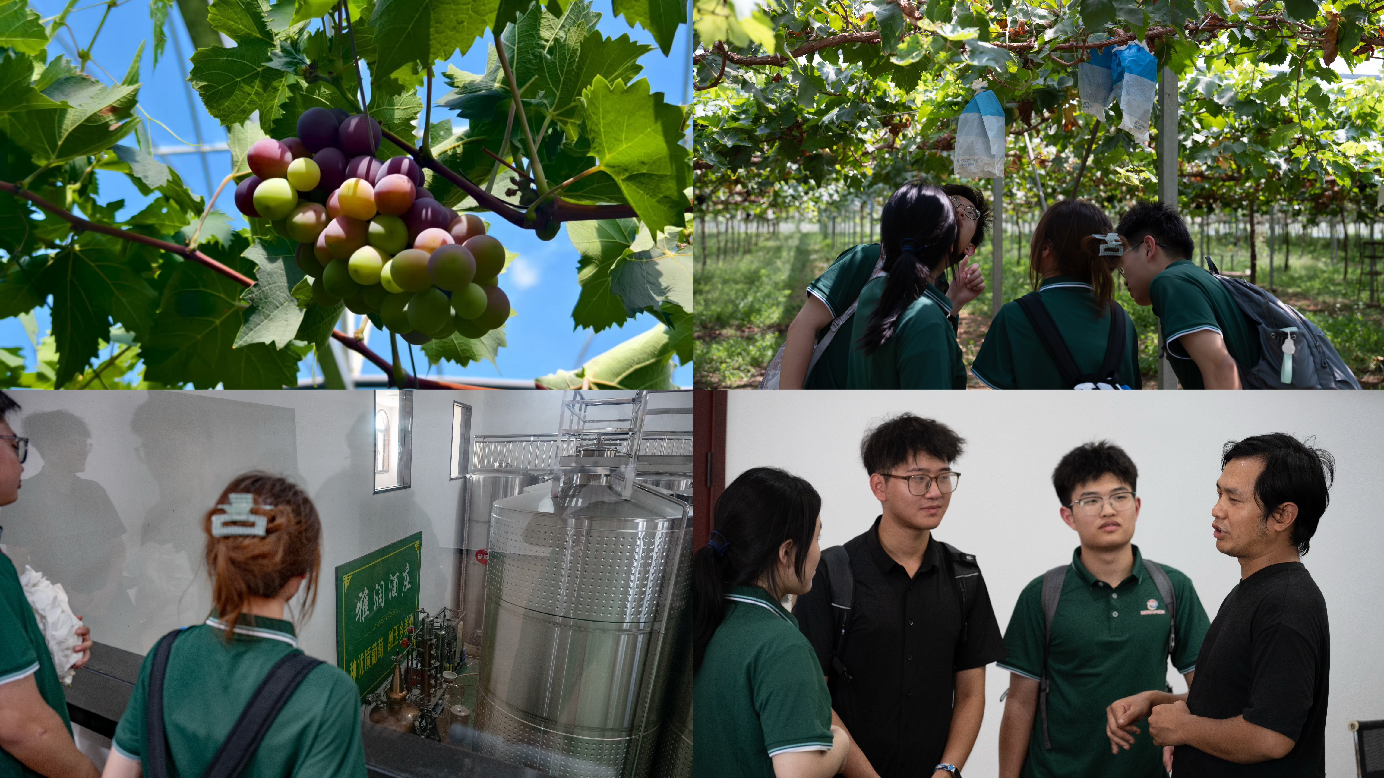 调研团队首先来到雅润酒庄有限公司葡萄种植园,科技创新赋能乡村振兴在此展开。穿梭于葡萄田中,团队与负责人贾老师站在葡萄架下聊了起来。“大叔,您这葡萄看着品相真不错,平时都用啥种植技术啊?”他用带着浓重乡音的普通话回答:“我们已与当地高校取得了合作,这一片是试验田,科技真好啊!”走入酿酒车间望着硕大的酿酒罐,贾老师说:“咱这酒是纯葡萄酿的,从种植到采摘到发酵成酒,需要的时间不下三年。但这样好在葡萄不担心存放问题了,销不出去的葡萄就做成葡萄酒,也有很多的公司与我们合作。”望着大型的机械设备,机械设计制造及其自动化专业的陈欣妍感叹道,“我们的专业知识就这样被应用在了农村农业中。”