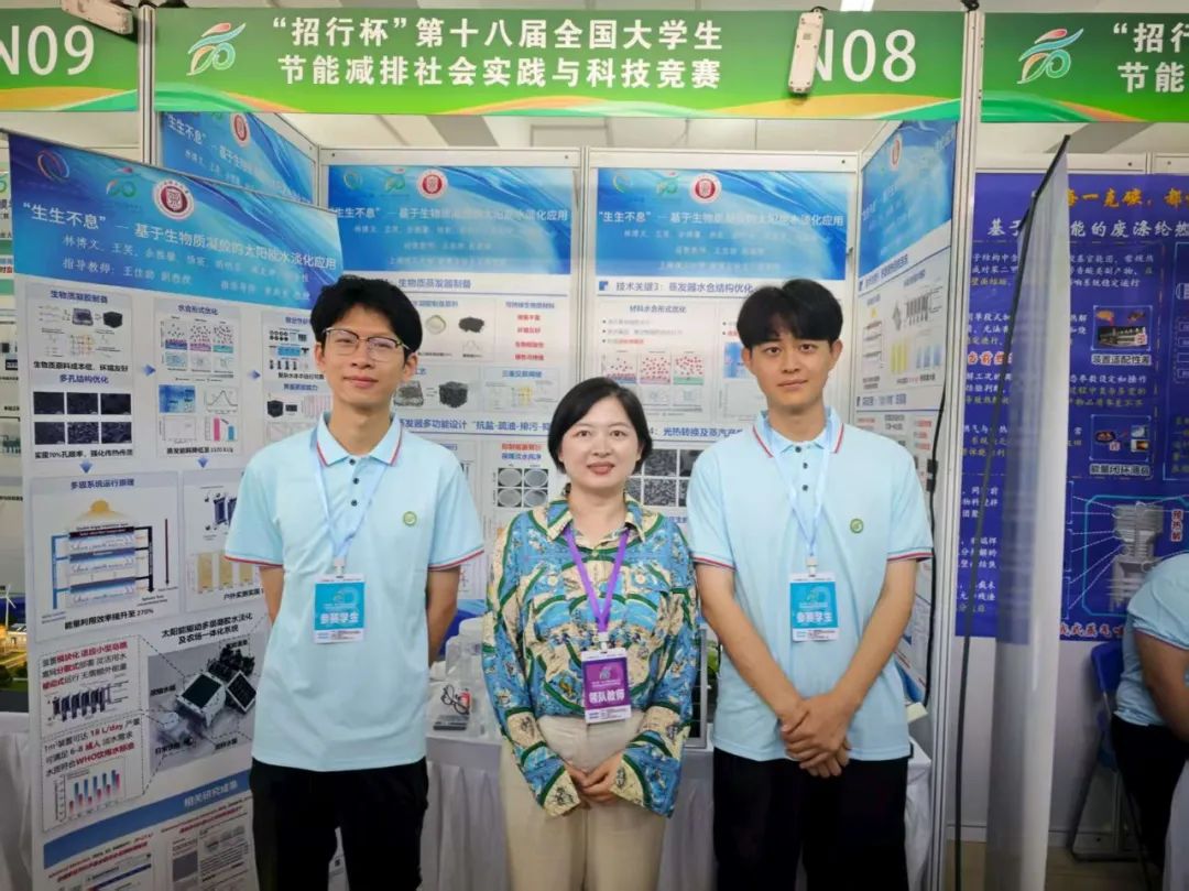 而另一组《生生不息——基于生物质凝胶的太阳能水淡化应用》项目团队同样历经波折。队长林博文说:“凝胶蒸发器的制备工艺需要反复调试,多级装置的性能优化屡屡碰壁…但大家从未退缩、通力合作,不断试错。”只要还能试下去,这场比赛就不认输!而指导老师王佳韵不断鼓励学生做“顶天立地” 的学问——既要高标准,也要接地气!在一次次精益求精的调整优化中,该项目最终获一等奖。