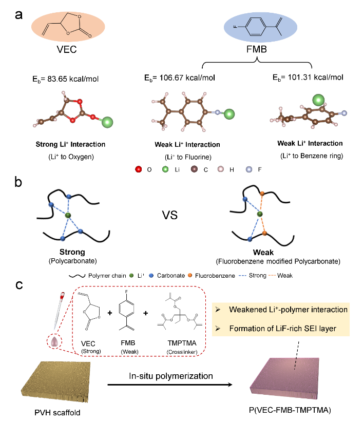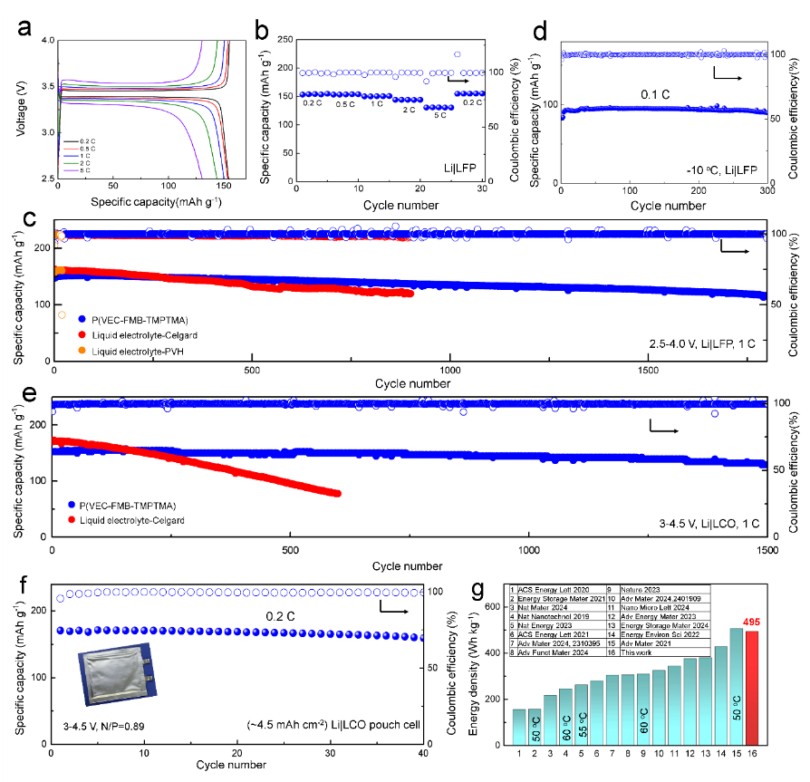 研究团队创新性地引入氟苯柔性链段,优化了电解质内部的离子传导环境,从而显著促进锂离子的快速迁移。基于这一设计,成功制备出厚度仅7.8 μm、离子电导率高达 4.8 × 10⁻⁴ S cm⁻¹的超薄聚碳酸酯固体电解质材料(图1)。在此基础上,团队进一步研制出兼具高安全性与长寿命的固态金属锂电池,表现出超长循环寿命和优异的快充性能,能量密度高达 495 Wh kg⁻¹。更为重要的是,即便在-10 ℃的低温环境下,固态电池仍能稳定运行,充分展现出面向全气候应用的巨大潜力。