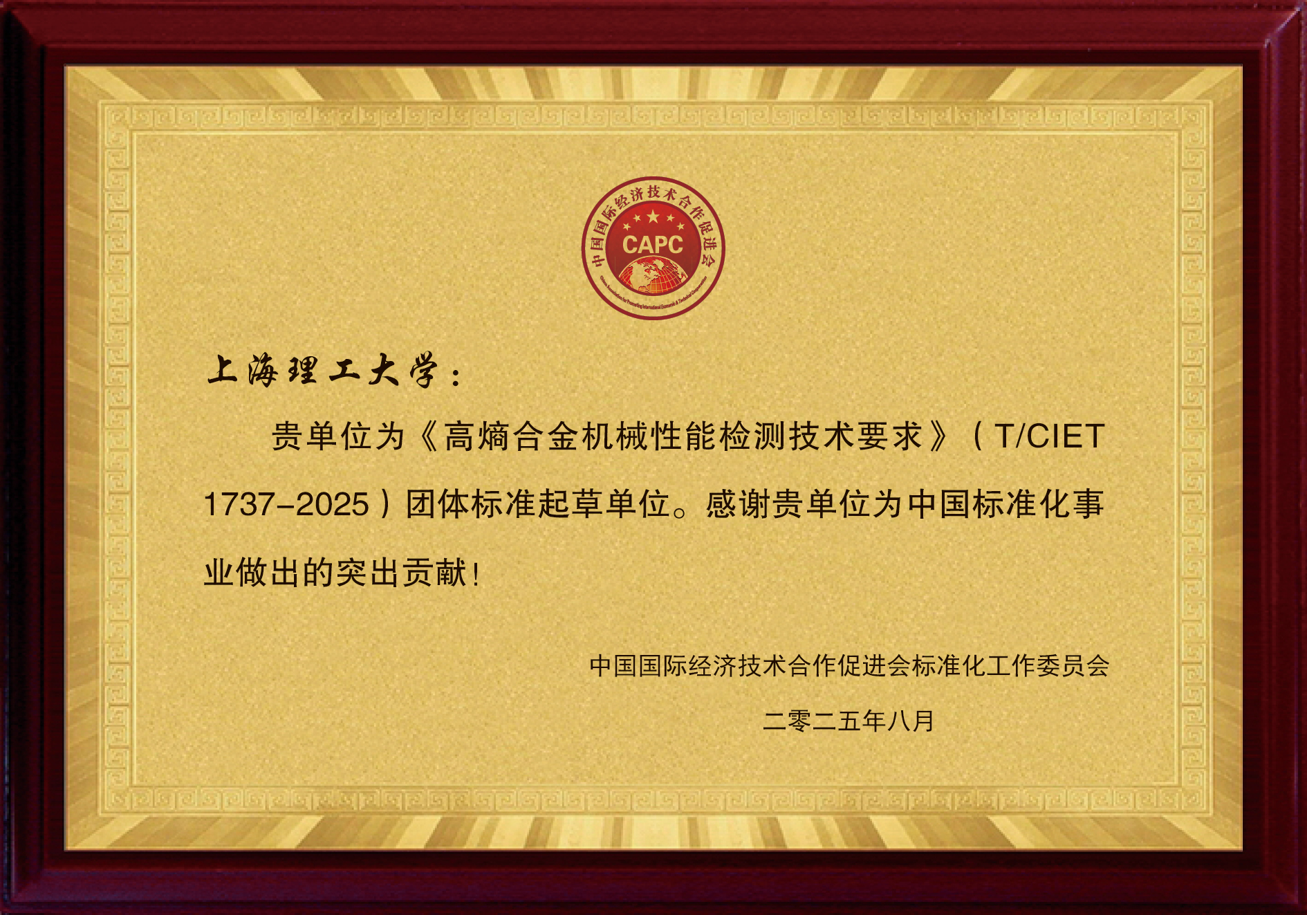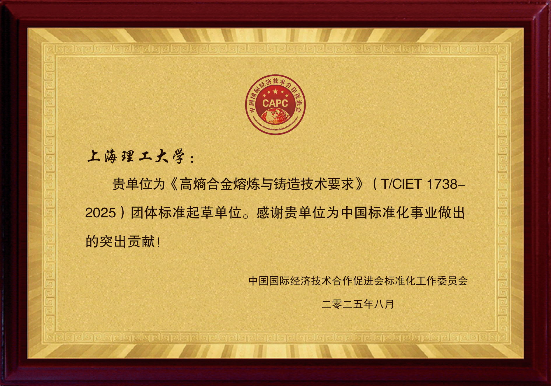 近日,从中国经济技术合作促进会标准化工作委员会获悉,由材料与化学学院丁志义老师主要参与起草的两项团体标准《高熵合金机械性能检测技术要求》(T/CIET 1737-2025)及《高熵合金熔炼与铸造技术要求》(T/CIET 1738-2025)已正式发布实施。此举标志着学校在高熵合金这一前沿新材料领域的标准化工作中取得了重要突破,为行业的规范与高质量发展贡献了“上理”智慧。