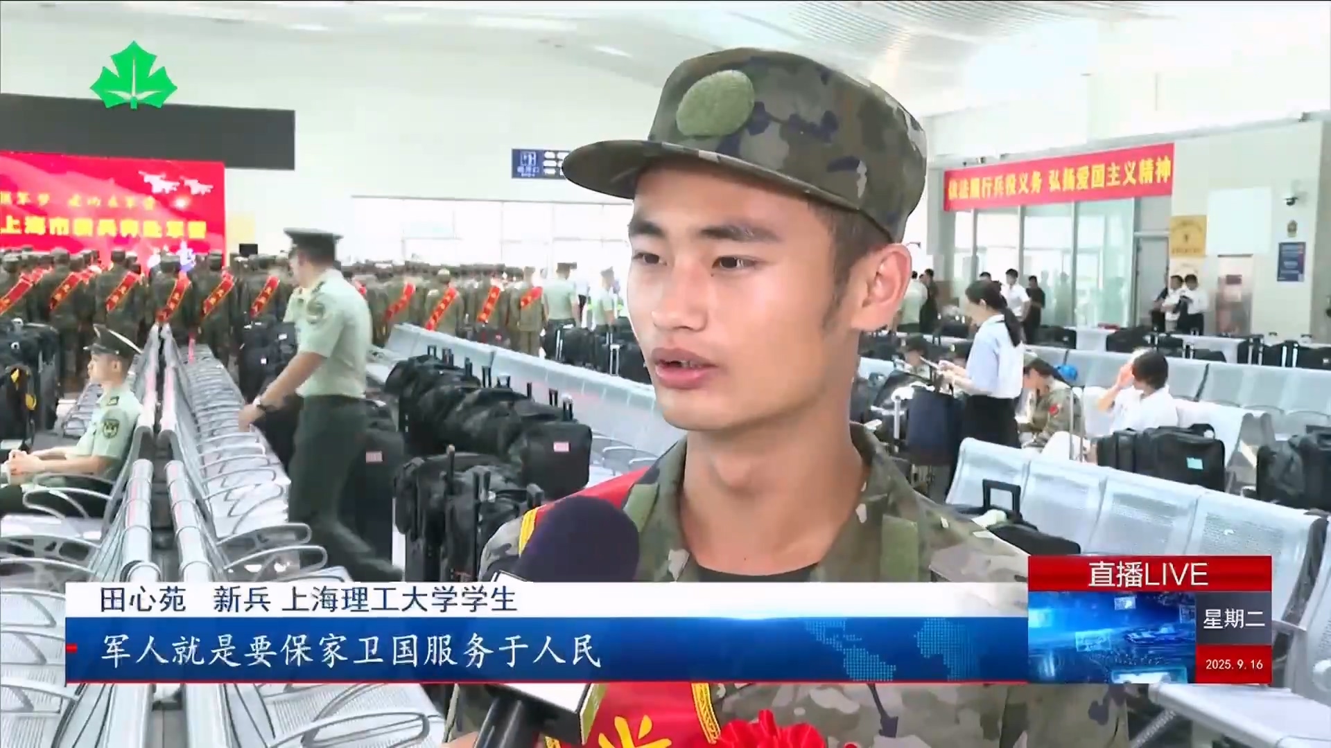 9月16日,上海市市委、市政府、上海警备区在上海火车站举行新兵欢送仪式,金沙官网基础学院入伍大学生田心苑接受上海教育电视台采访,在采访中,田心苑表示:“军人就是要保家卫国服务于人民,相信在部队的历练下,我也可以很好地履行这份责任,为国家贡献出自己的力量。”