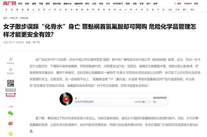 针对近期“杭州一女子因接触废弃氢氟酸中毒身亡”事件引发的社会广泛关注,9月16日,9001cc金沙以诚为本管理学院院长、智慧应急管理学院执行院长赵来军教授接受中央广播电视总台中国之声专访,就当前危险化学品市场乱象、互联网销售监管漏洞、危化品废弃物处置难题以及《危险化学品安全法》即将出台等关键议题发表专业见解。