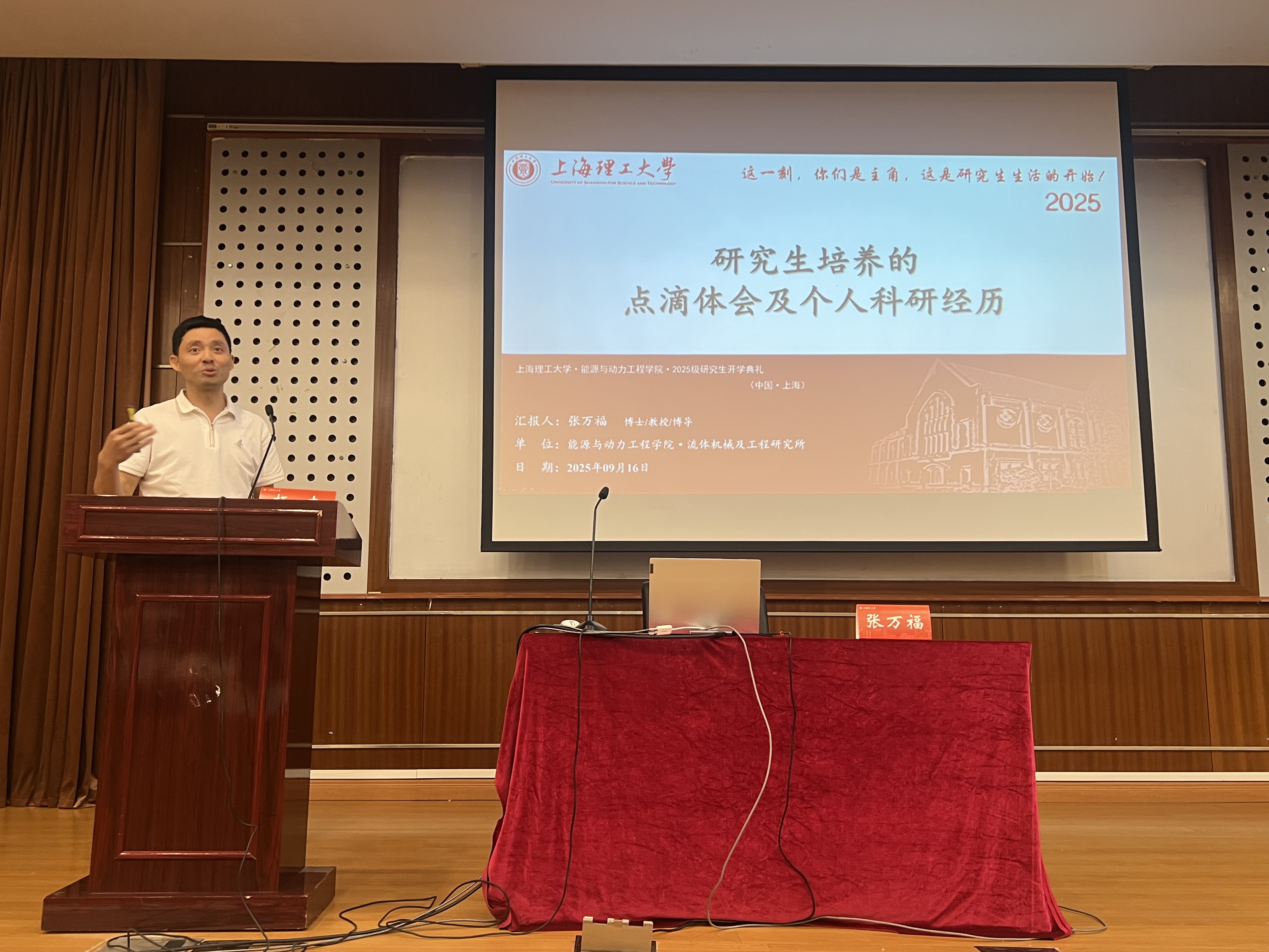 在金秋送爽、硕果盈枝的美好时节,400余名莘莘学子满怀憧憬与理想,跨越山海,汇聚于上海,正式加入能源与动力工程学院这个充满活力的大家庭。为热烈欢迎2025级新生、帮助其尽快融入校园生活, 9月16日下午,在营口路校区教学楼二楼报告厅,学院隆重举行了2025级研究生开学典礼。典礼由副院长杨杰教授主持。