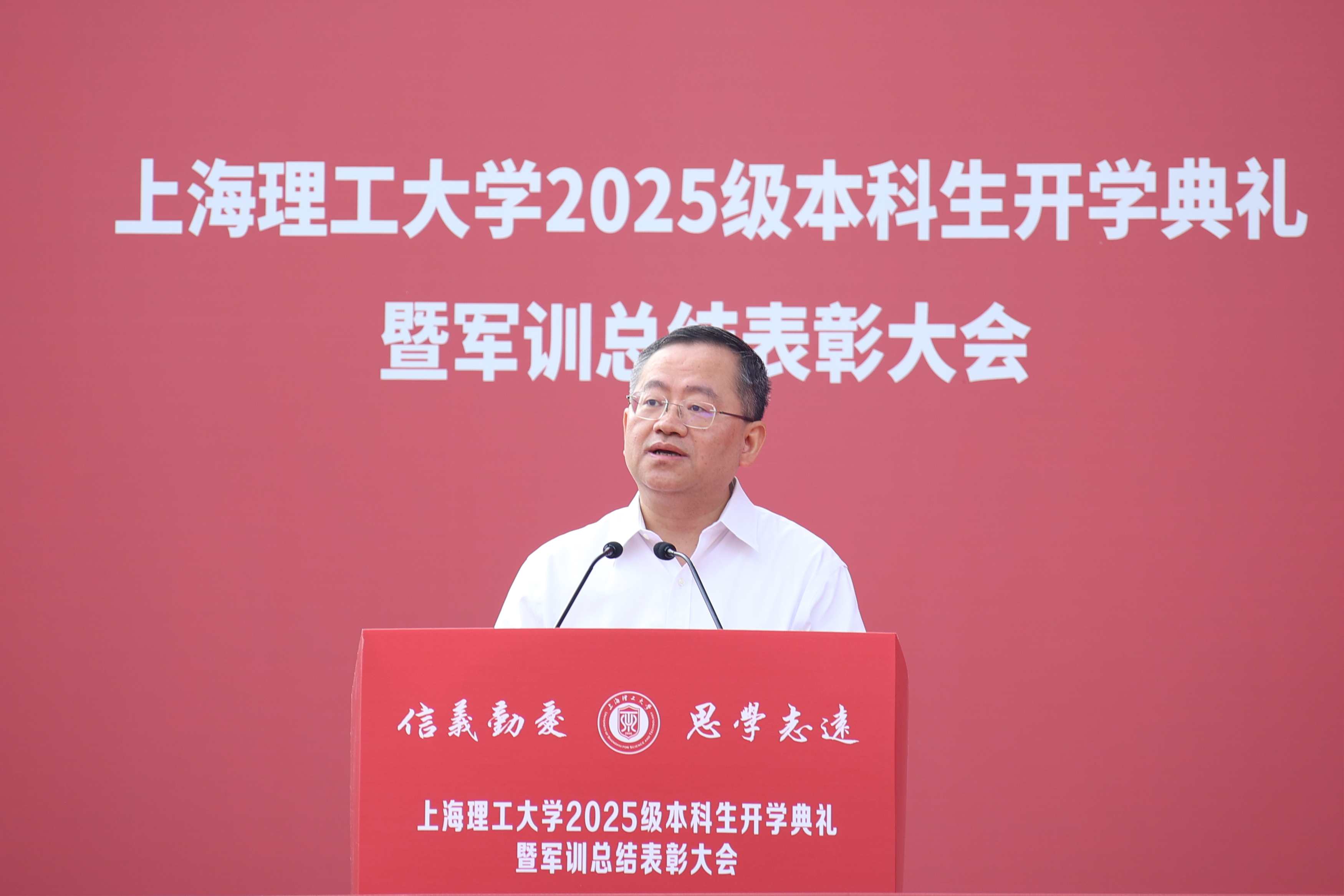 校长朱新远以“敢为人先,追求卓越”为题勉励新生。他向2025级新同学表示热烈欢迎,向辛劳付出的承训教官们表示衷心的感谢。适逢中国人民抗日战争暨世界反法西斯战争胜利80周年,朱新远在讲话中深情回顾了建国初期上理人不畏艰难、报国图强的办学历程。他勉励新同学一要秉持“敢探未知”的钻劲,筑牢卓越之基。充分利用学校搭建的成长支持体系,既要读好“有字之书”,打牢专业基础,又要读好“无字之书”,提升动手能力;二要怀抱“敢破边界”的闯劲,拓展卓越之界。面对社会发展的时代背景,要敢于打破边界,跨界融合,激活创新动能;三要传承“勇担使命”的干劲,把握卓越之机。面临建功立业的人生际遇和国家所需,锚定产业痛点和行业前沿,以实际行动和家国情怀,实现自己的卓越价值。