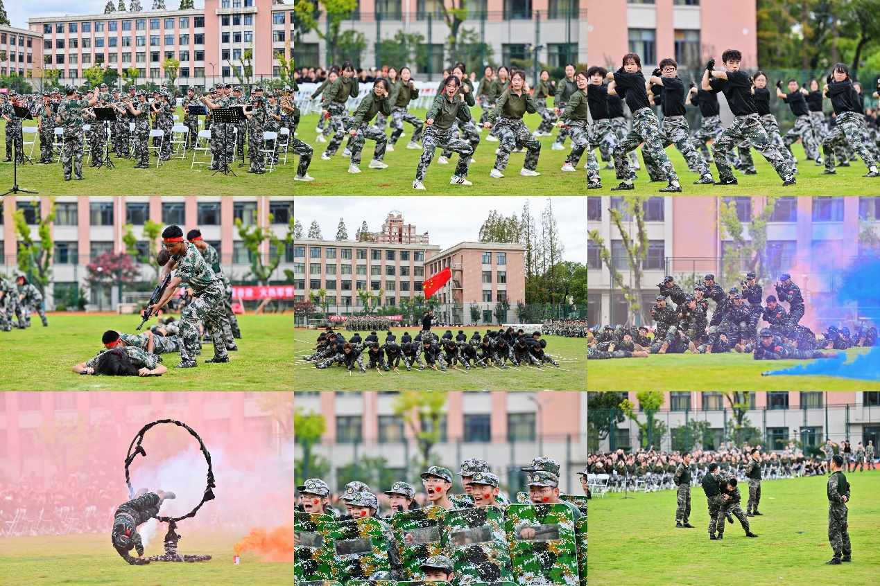 在汇报表演环节,2025级新生与教官携手,呈现出一场活力与力量交织的“交响乐”。军乐队演奏、匕首操、擒敌拳、刺杀操、应急棍术、警棍盾牌操、特战突击、摔擒对抗等8个项目轮番上演,展现出上理学子不畏艰难、一往无前的精神,诠释了热血青年披荆斩棘、枕戈待旦的坚定意志,赢得了现场阵阵掌声与喝彩。