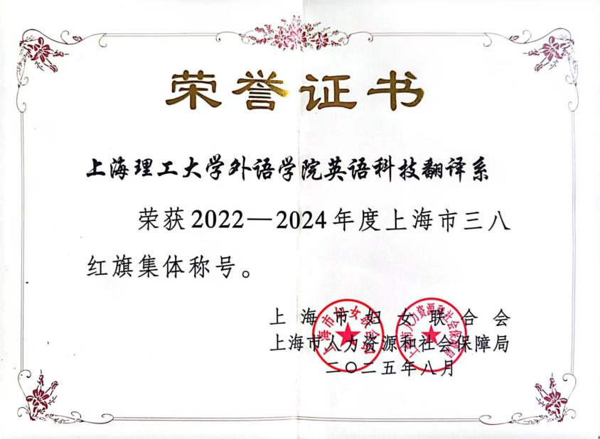 近日,上海市妇女联合会与上海市人力资源和社会保障局联合公布了2022-2024年度上海市三八红旗手(集体)表彰名单,外语学院英语科技翻译系凭借卓越的教学科研成果和突出的社会贡献,被授予“上海市三八红旗集体”荣誉称号。这一荣誉彰显了英语科技翻译系在高等教育领域的引领作用,以及女性教师团队在推动学科创新和服务国家战略中的关键角色。