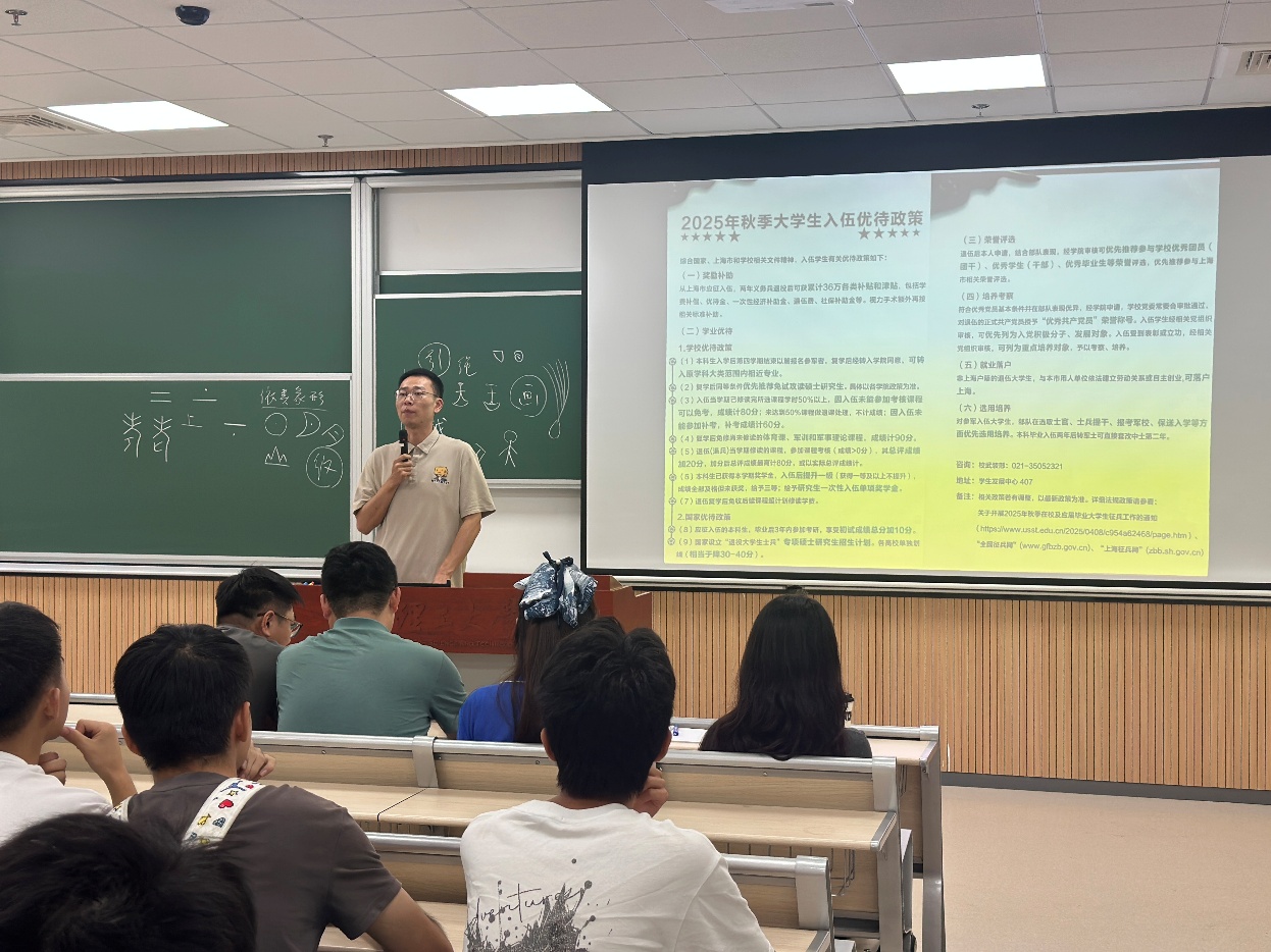 为鼓励学生携笔从戎,多元发展,学院武装专项指导老师王翀为同学们进行了大学生应征入伍政策的专题解析。他详细介绍了国家鼓励大学生参军报国的各项优惠政策、入伍流程及发展前景,激发了同学们的爱国热情与报国志向,为有志于投身国防事业的同学指明了具体路径。
