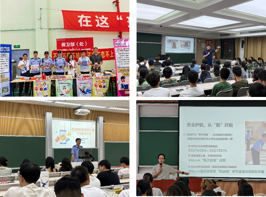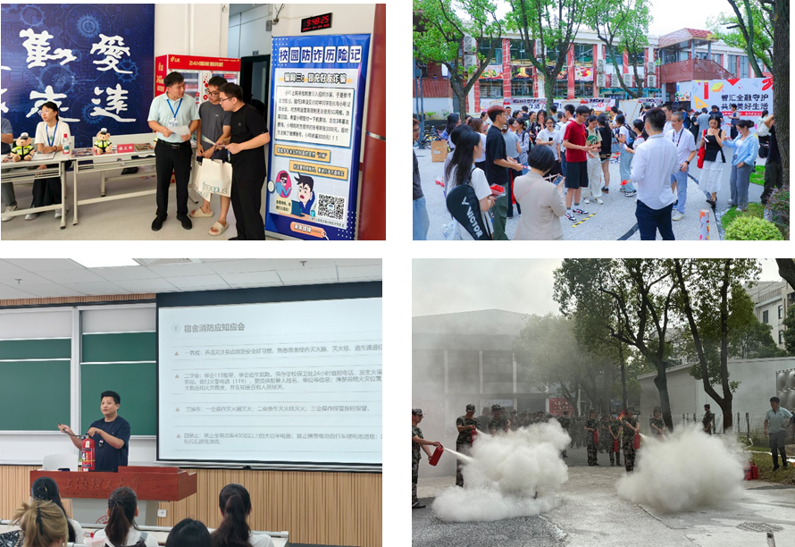 在营口路校区研究生新生报到点,保卫部(处)咨询点设电信网络诈骗防范互动环节,直击“刷单返利”“游戏装备交易”“冒充老师收费”“论文发表诈骗”等研究生高发诈骗套路;在第五食堂前广场举办的电信网络诈骗防范主题游园会上,“反诈新成语”“防骗知识扭蛋机”等四大闯关项目人气“爆棚”,600余名学生参与活动,并纷纷表示通过形式多样、丰富多彩的活动,自身反诈防骗意识不断提升,在日常学习生活中会更加留意不要落入“陷阱”;在各二级办学机构组织的新生安全教育专题大会上,保卫干部将灭火器、灭火毯、手动报警按钮等灭火逃生设备带到现场,为与会同学们详细演示使用方法和使用步骤;在军训训练场上,消防救援大队消防员带领同学们现场体验消防水带铺设、灭火器灭火实操,切实掌握“提拔握压”操作规范等消防灭火核心技能;在新生主题班会中,各新生班主任以系列宣传短视频的形式解析校内外交通规则和注意事项,充分做好交通安全提醒;保卫部(处)还积极组织全校学生尤其本研新生参与2025年上海高校学生国家安全素养展示活动线上挑战赛,“以赛代练”提升大学生总体安全素养,促进大学生掌握并深化防范技能。