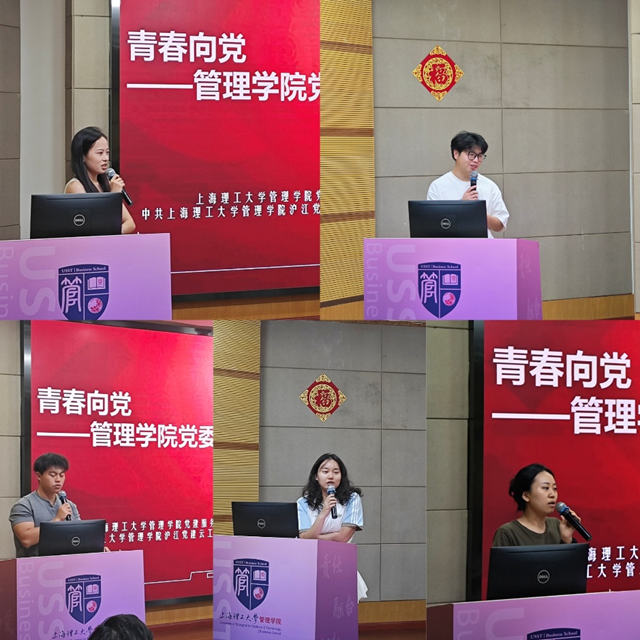 沪江党建云党支部李鑫、宋俊杰等五位学生党员依次登台,分享了他们的入党心路历程。他们结合自身在专业学习、社会实践、服务师生等方面的切身体会,生动讲述了如何从一名普通学生逐步成长为一名共产党员的过程,他们的分享真实恳切,展现了新时代学生党员的责任担当与先锋形象,为在场的同学提供了宝贵的借鉴。同时,支部的入党积极分子也利用此次机会分享和汇报了近期的思想动态。