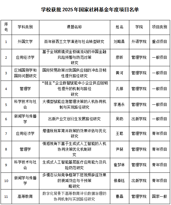 近日,全国哲学社会科学工作办公室、全国教育科学规划办公室先后公布了2025年国家社会科学基金年度项目和2025年国家社科基金教育学年度项目立项结果,金沙官网共计11个项目获批,年度项目获批总数创历史新高。