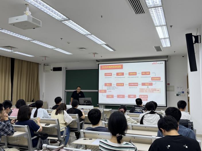 为精准助力理学专业学子把握国考机遇、破解就业规划难题,理学院于10月16日打造2026国家公务员公告解读及备考指导专场讲座。学院特别邀请中公教育上海研究院骨干师资袁少奇,为学子带来针对性极强的就业指导分享,以专业服务打通国考备考“最后一公里”。