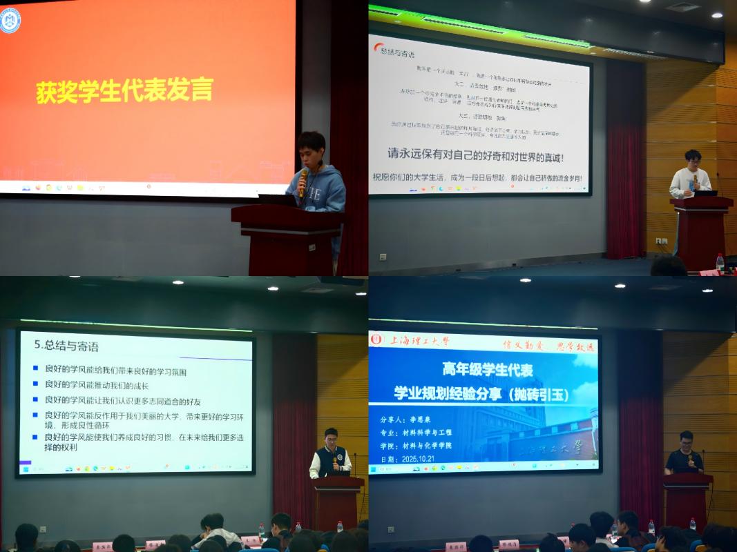 获奖学生代表黄杰在发言中向上海斯麟公司及学院表达诚挚感谢,并结合自身学习经历分享成长感悟。他呼吁全体同学以热忱深耕专业知识,以跨界视野拓宽认知边界,以实践行动锤炼过硬本领,踏实走好材料学科探索之路,努力创造有价值的学术成果与社会贡献。