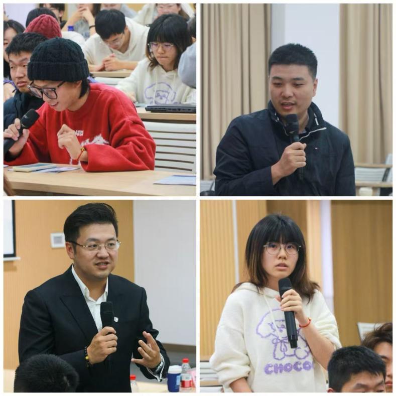 在随后的交流研讨环节,同学们踊跃提问,围绕“是否需要继续提升学历”“实习选择”“专业与岗位匹配”等话题与校友展开热烈互动。校友们耐心解答,现场气氛活跃,思维碰撞不断。