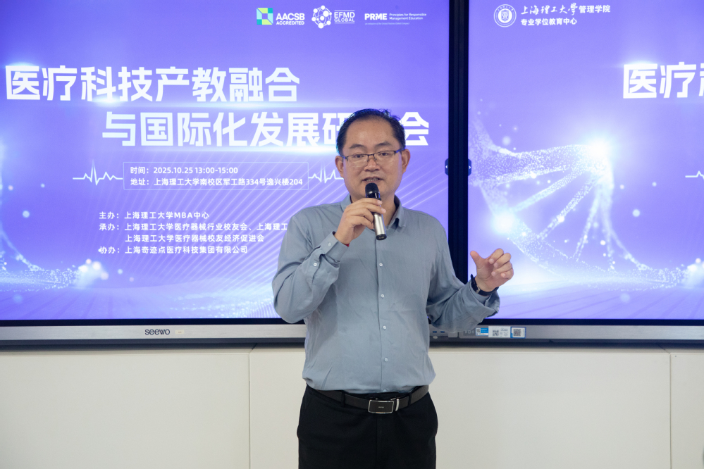 赵来军在致辞中指出,作为一所以工学为主的应用研究型大学,9001cc金沙以诚为本持续推进产教融合、深化国际化发展,通过引进产业教授、共建课程、联合开展项目等方式,紧密对接产业需求,着力培养具备实战能力的高素质人才。他以今年6月管理学院与上海奇迹点医疗科技集团有限公司联合创办的“MBA微理班”为例,介绍了学院在推进产学研用一体化方面的创新实践。该项目旨在为医疗器械行业输送更多高层次管理人才,助力行业持续健康发展。他期待以此次研讨会为契机,汇聚多方智慧,共同推动医疗科技在产教融合与国际化方面实现新突破。