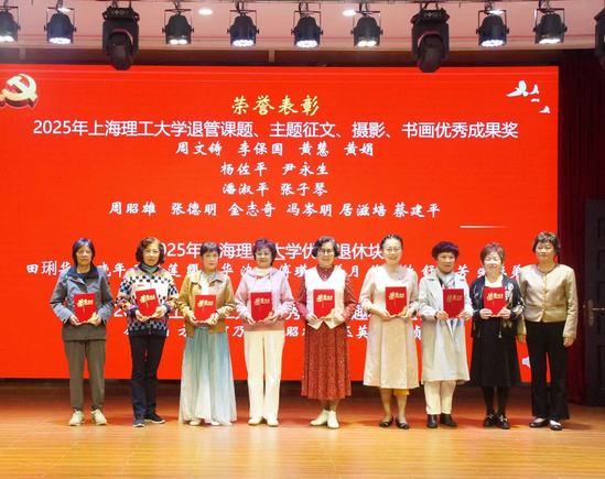 振奋人心的校情通报后,活动进入颁奖与文艺表演环节,用荣誉致敬奉献,用歌声传递温情。颁奖环节,孙红为“学校优秀退休块组长、退管课题、征文、摄影等优秀成果奖”获奖者颁奖;贺莉为学校“卓越党支部创建优秀党建案例、关工委参与助学帮困案例成果奖”获奖集体与个人颁奖;王凌宇为“上海市教育系统关工委先进个人、上海高校优秀特邀党建组织员、教育部关工委‘枫叶正红’最佳征文”获奖者颁奖。