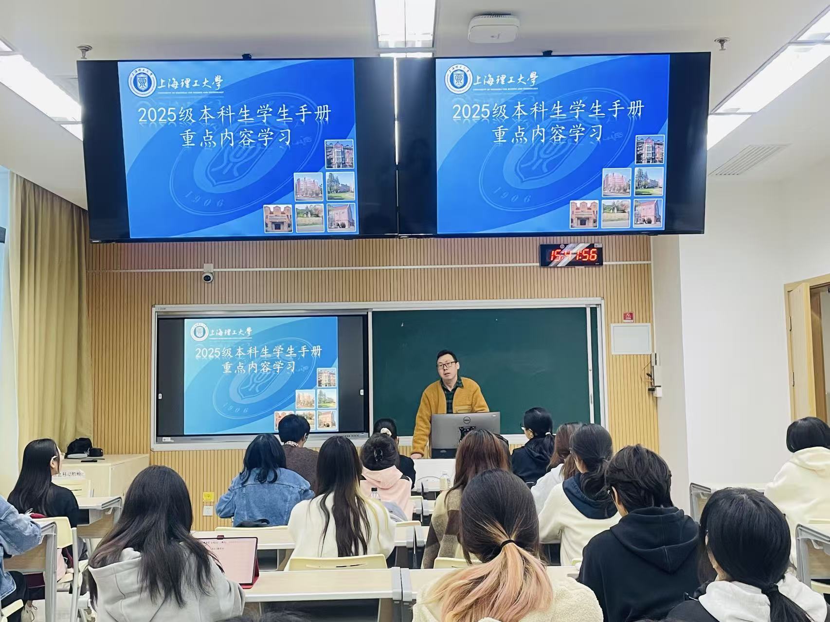 牛光辉对《2025级本科生学生手册》中的重点内容进行了系统梳理与解读,围绕学籍管理、校园秩序、奖励处分、考试纪律等方面展开,帮助班委明确规章制度,在班级发挥模范带头作用。在学籍管理部分,牛光辉讲解了每学期开学注册、休复学申请流程与条件以及学业警示与退学警告的学分要求,引导学生重视学业,做好规划;在行为规范方面,详细说明了校园内严禁酗酒、赌博、传播非法物品等违纪行为,并阐述了从警告至开除学籍的处分等级,特别强调了考试作弊、代考等学术不端行为的严重后果。同时介绍奖学金的评定依据、宿舍管理的安全须知(如违章电器界定、门禁制度、留宿规定等)进行了重点说明,提醒同学们严格遵守制度,共同维护安全、文明、有序的校园环境。