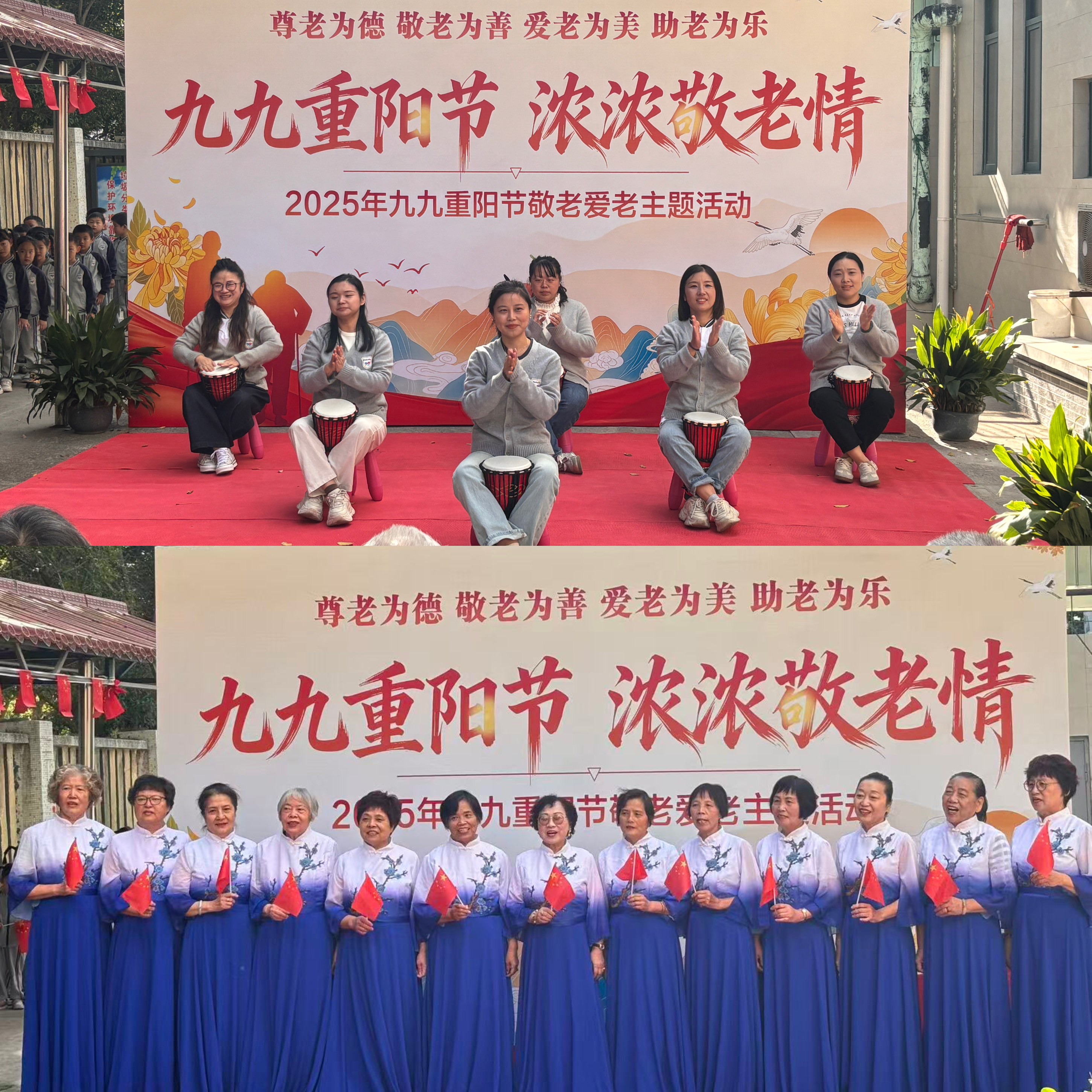 随后,凯琴幼儿院教师团队表演了非洲鼓节目《月亮照山川》,延东东鑫合唱团则演唱了歌曲《我们是快乐的好朋友》,全体人员共同合唱《强军战歌》,为老人们送上节日问候。