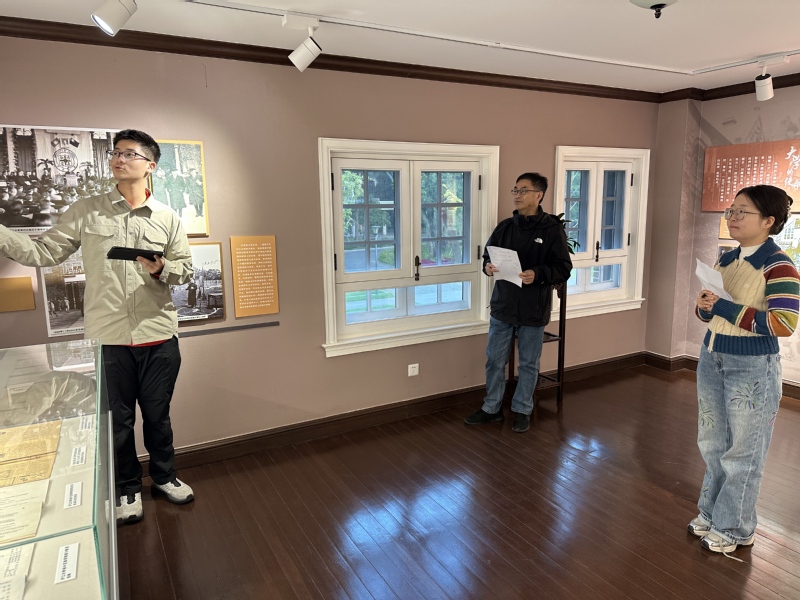 10月24日,档案馆肖琳琳将教学场景延伸至校史馆与刘湛恩烈士故居红色文化主题馆,主打“沉浸式实操能力提升”。她通过现场示范与互动指导,引导讲解员精准把握各展区展板内容的重难点;组织学员逐句研磨讲解词,优化语言表达与情感传递;同时系统传授讲解礼仪规范及临场应变策略,助力讲解员将理论知识转化为实践能力,全方位提升讲解专业度。