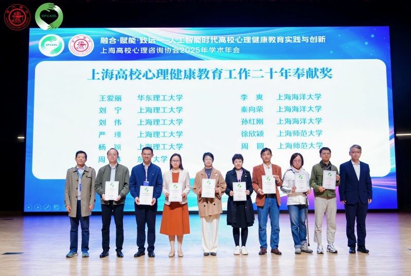 在备受瞩目的年度奉献奖颁奖环节,金沙官网教师收获颇丰。学生工作部(处)刘伟、杨颎,管理学院严瑾、刘宁四位老师荣获“上海高校心理健康教育二十年奉献奖”。中英国际学院蔡卉,机械工程学院韦彪、陈璇,健康科学与工程学院谢宝歆四位老师荣获“上海高校心理健康教育十年奉献奖”。这一奖项是对长期坚守心理育人一线、默默奉献的致敬与肯定。