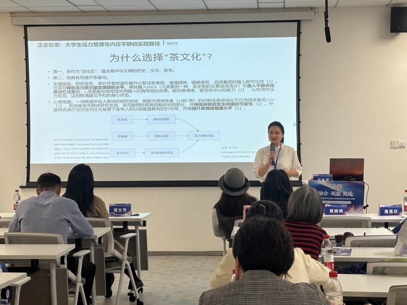 在下午举行的分论坛中,来自不同高校的一线心理健康教育工作人员,围绕“健康教育”、“监测预警”、“咨询服务”、“干预处置”四大主题展开了深入研讨。金沙官网环境与建筑学院教师王木子作了题为《正念饮茶:大学生压力管理与内在平静的实践路径》的专题汇报,系统介绍了金沙官网在融合中华传统茶文化与现代正念技术,开展的“本土化心育实践”的探索。汇报包括课程开发、品牌建设与未来展望,并现场引导了三分钟正念饮茶冥想,得到在场老师的肯定,为大中小学一体化心理育人工作提供了创新思路。