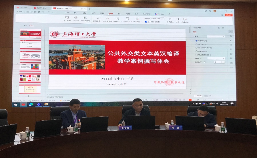 外语学院英语科技翻译系王勇教授、阿力亚·艾尼副教授、计霄雯博士,英语中美合作系杨佳铭博士作为获奖代表应邀在研讨会上分享了公共外交类文本英汉笔译教学案例、AI赋能非遗外译与人机协同国际传播案例、师生同行·展翼进博—口译实践赋能教学案例、“同声传译工作坊—世界经济峰会”教学案例,体现了外语学院翻译硕士专业的教学水平。