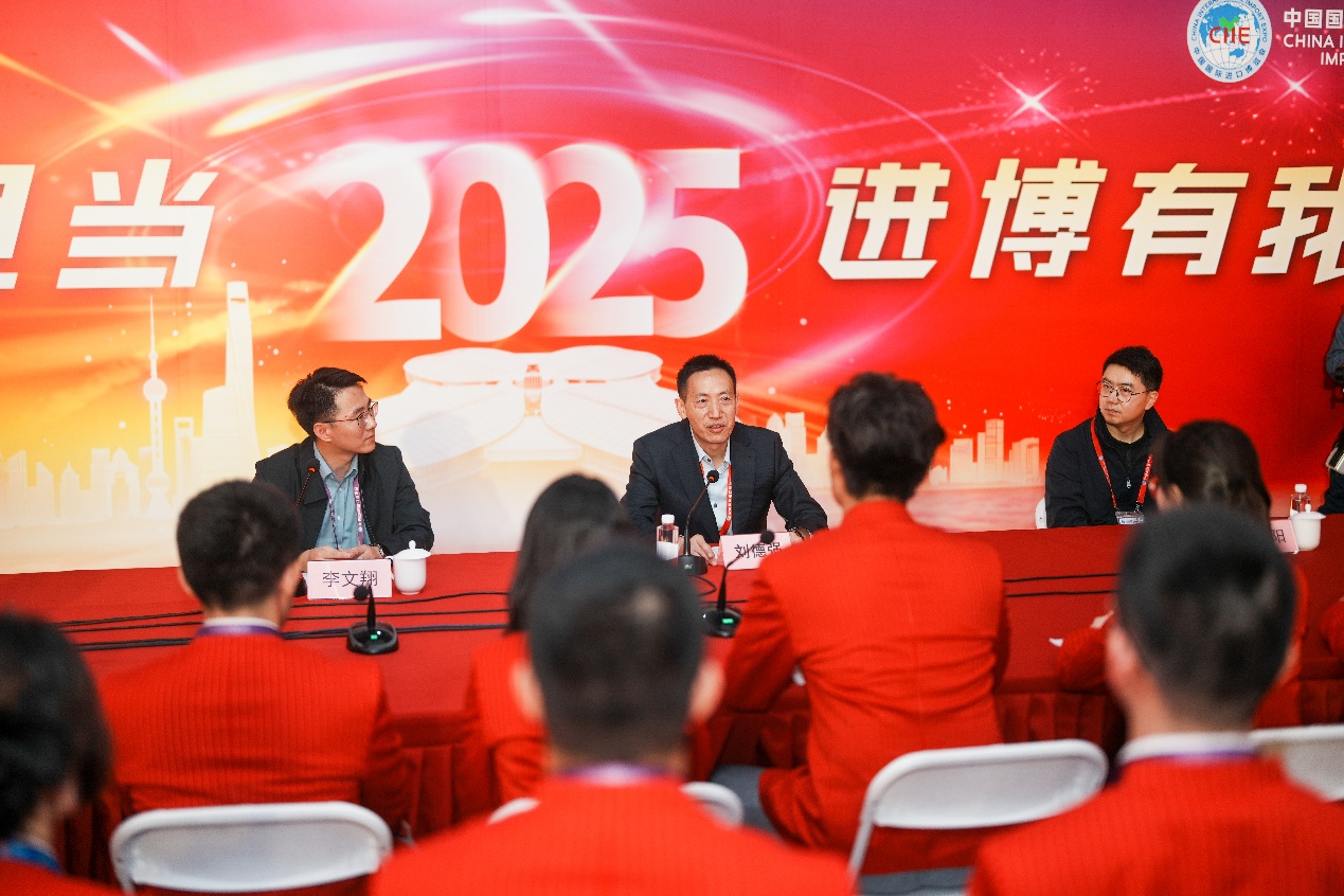 随后,校领导来到志愿者之家,与志愿者们亲切交流。刘德强以“科创报国与开放共赢:在进博舞台书写青年答卷”为主题,为志愿者们讲授了一堂生动的微党课。多位“小叶子”代表踊跃发言,分享了参与进博服务的初心、收获与感悟。他们纷纷表示,这段“累并快乐着”的服务经历将成为大学生涯中难忘的珍贵记忆。刘德强认真倾听同学们的发言,细致询问大家的工作安排与后勤保障情况,并对志愿者展现出的责任与担当表示赞许。