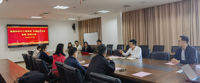 11月10日下午,健康科学与工程学院生物技术专业启动实施“培英计划”。学院党委副书记李陈财、生物技术系教师及入选该计划的学生代表等齐聚一堂,共同见证这一助力学生成长发展的时刻。会议由生物技术专业负责人张建国教授主持。