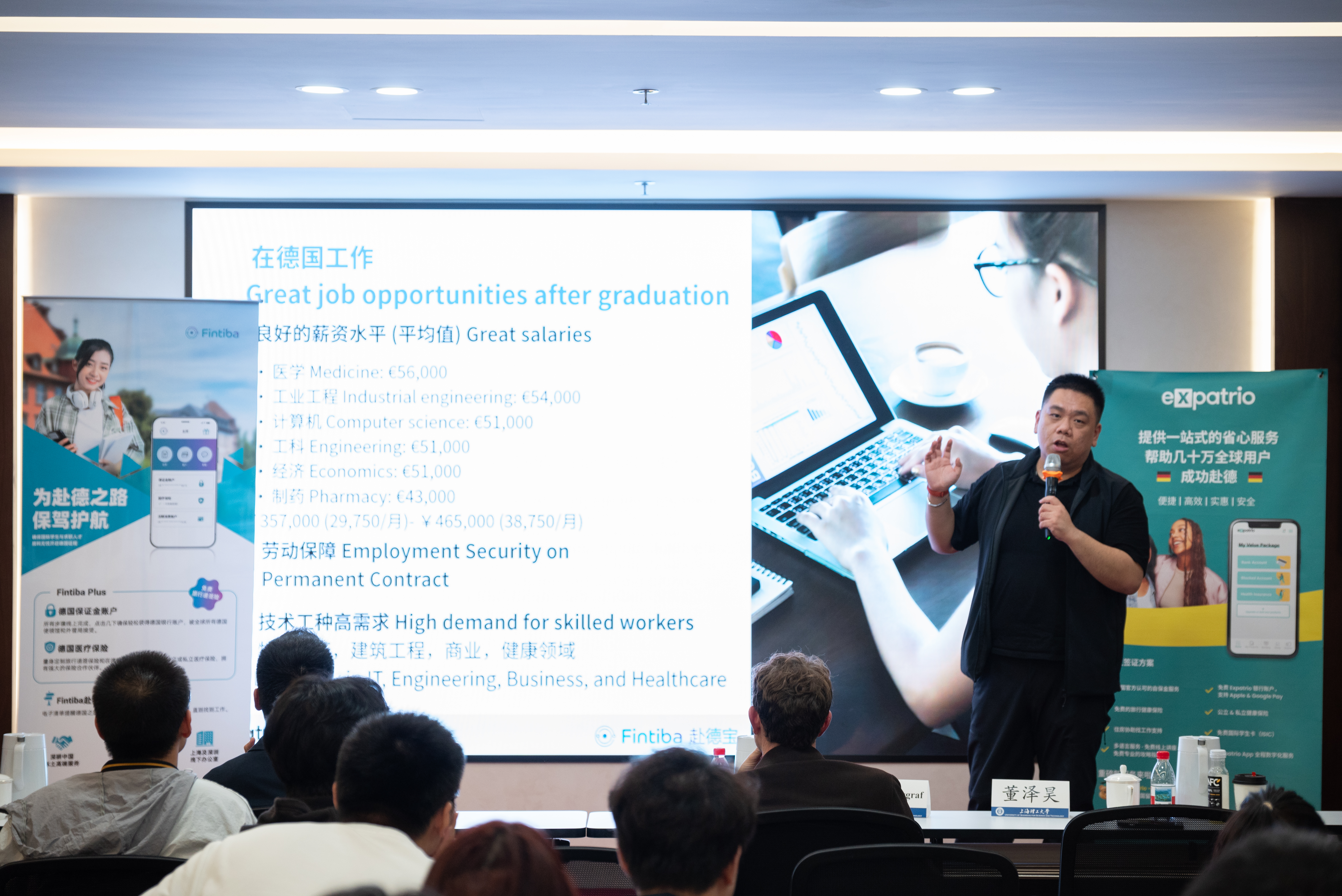 在分享环节,Jonas Marggraf先生以“为什么选择德国”为主题,从教育质量、就业前景和生活成本三大方面全面阐述了德国留学的独特优势。他指出,德国公立大学的免学费政策及工科教育的世界领先地位,使其成为众多国际学生心目中的“高性价比留学目的地”。随后,石柱(Stone Shi)先生结合自身的求学与工作经历,进一步介绍了德国高校的国际化水平及其在机械、汽车、化工等产业领域的优势,强调了留学生在德国广阔的职业发展空间。