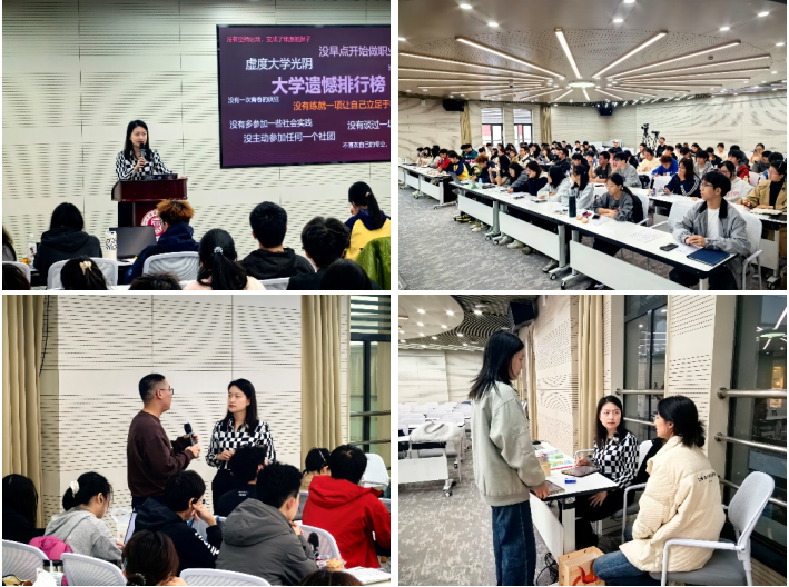 徐欧老师围绕“认识自我·从容启程”主题,系统开展四模块指导。首讲MBTI性格解析,强调非标签化,聚焦性格与职业环境、团队模式的适配逻辑;次析职场竞争力,提出“硬技能(技术能力)+软素质(学习力、协作力)”双轮策略,建议通过项目实践积累“能力证据”;针对求职压力,传授目标拆解、社会支持系统构建等工具,助学生转化焦虑为成长动能;末以“职场新人进阶”收尾,详解职业竞争力内涵,覆盖学生思维到结果导向、沟通边界感、团队破冰术等实操要点,为从校园到职场的关键跨越提供全链条指引。