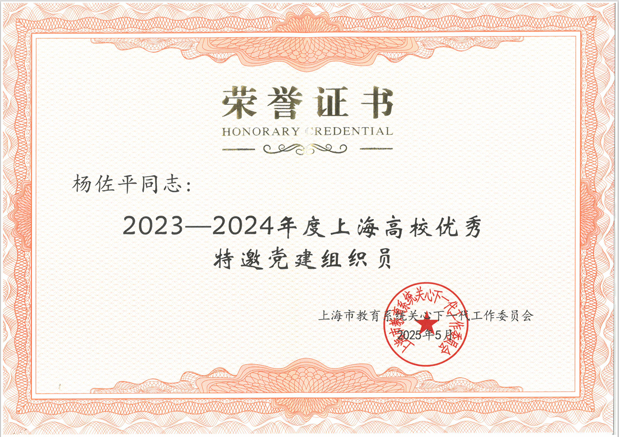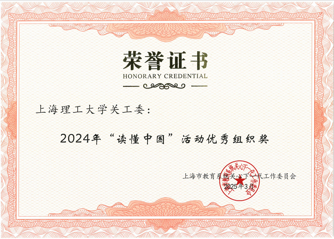 此外,金沙官网关工委亦获评多项荣誉:校关工委荣获“2024年‘读懂中国’活动优秀组织奖”;杨佐平同志获评“2023-2024年度上海高校优秀特邀党建组织员”。在课题研究方面,校关工委荣获“上海市教育系统关心下一代工作课题研究优秀组织奖”;校、院关工委共获得上海市教育系统关心下一代工作“课题研究成果奖”特等奖1项、一等奖2项、二等奖2项、三等奖6项。