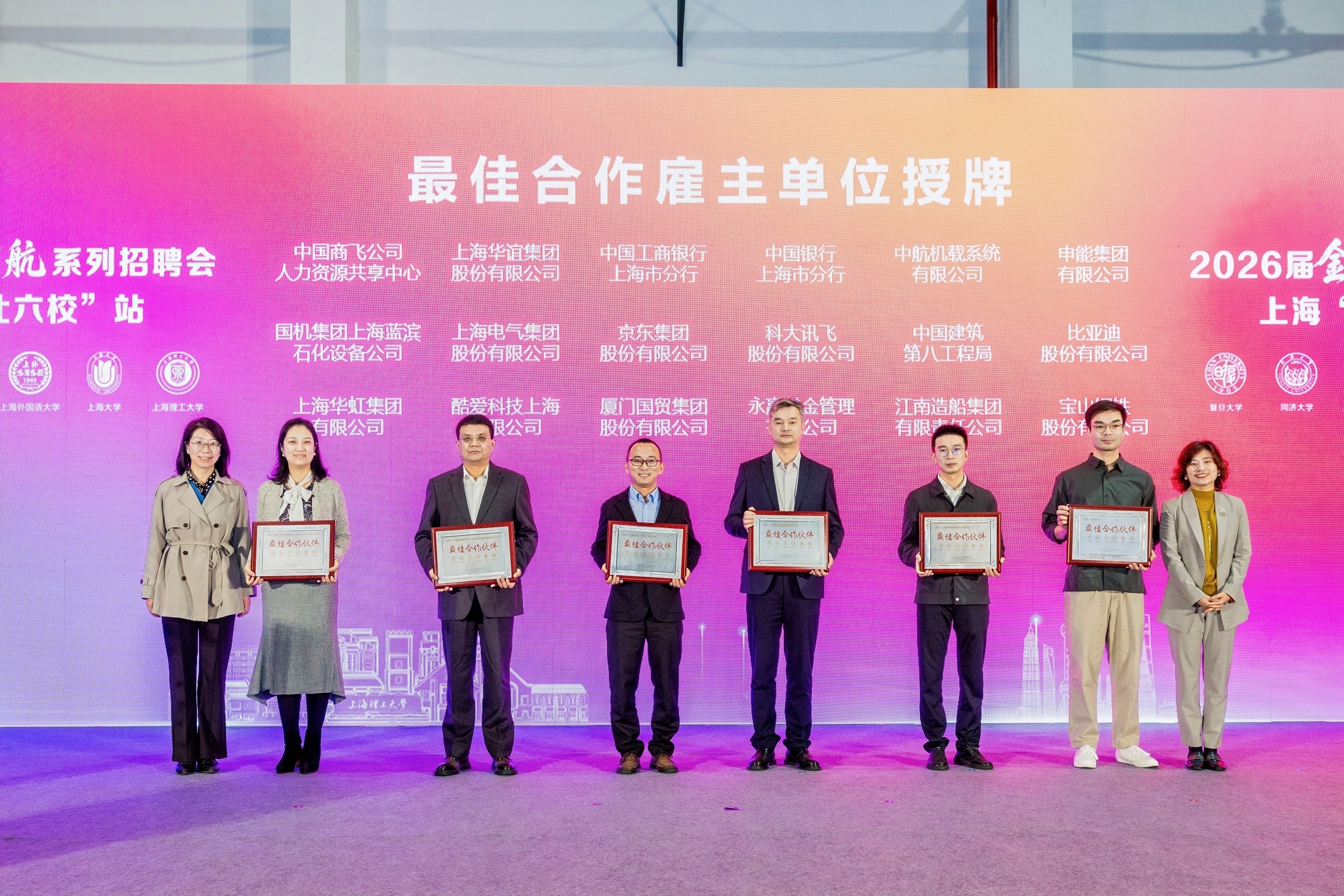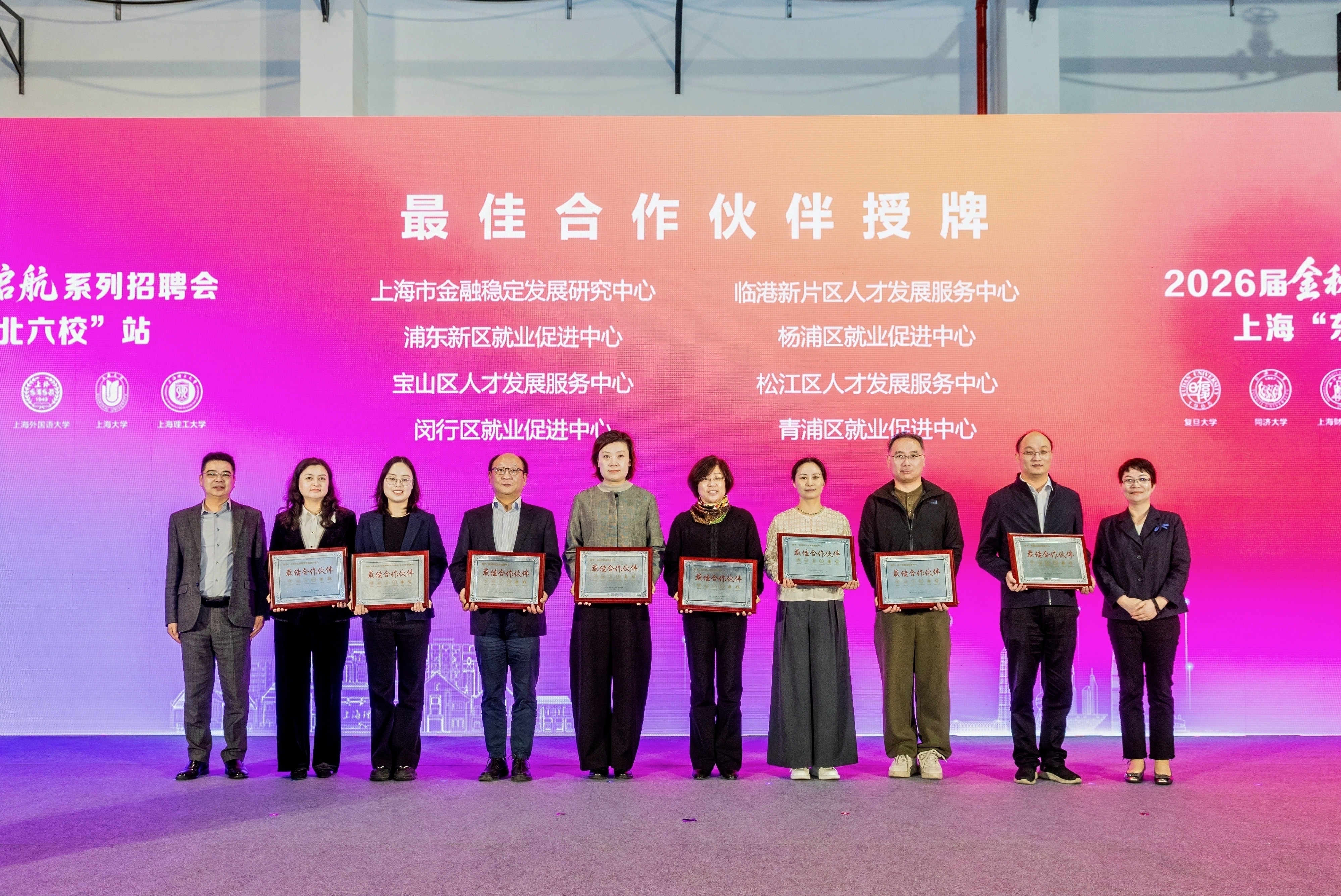 校地合作是推动就业工作的重要支撑。上海市就业促进中心副主任赵晓云、上海市教育委员会学生处副处长周红星为市金融稳定发展研究中心、临港新片区人才发展中心、杨浦区就促中心等8家单位授予“最佳合作伙伴”称号。同时,为助力毕业生明确职业方向,活动举行学生生涯导师聘任仪式。上海市就业促进中心职业介绍处处长王晓亮、杨浦区人力资源和社会保障局局长邓远见等嘉宾为导师们颁证,岳鹏、张丽莉等14位来自企业和行业的资深专家接过聘书,正式成为大学生生涯发展的“引路人”。仪式上还发布了“最佳合作雇主单位”,涵盖航空制造、先进制造、金融科技等多个重点领域的18家优质企业。