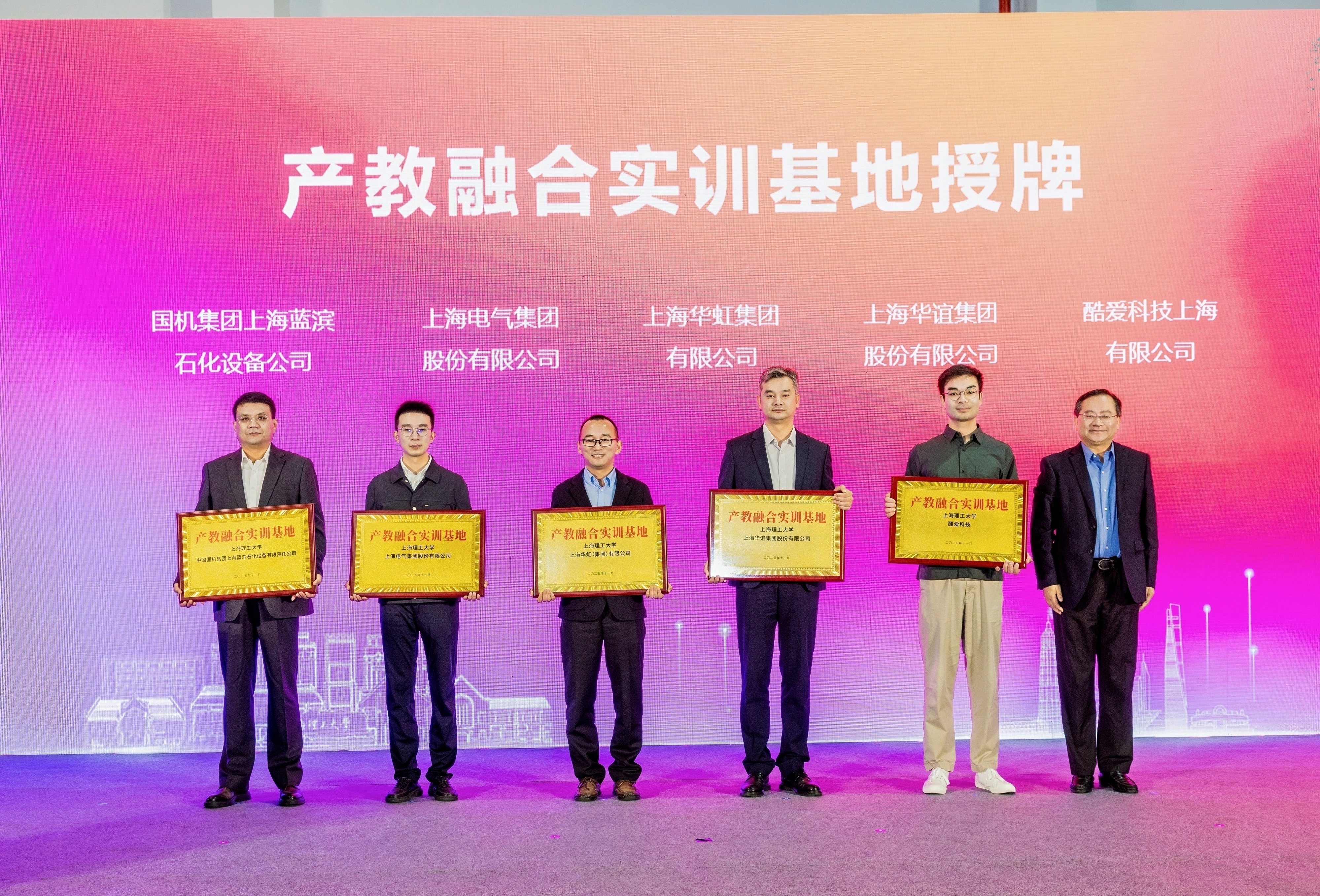 深化产教融合,是提升人才培养针对性和适应性的关键路径。在“产教融合实训基地授牌”环节,华虹集团、华谊集团、上海电气集团、国机集团上海蓝滨公司、酷爱科技等五家重点企业被授予实训基地,朱新远为企业代表授牌。这些实训基地将为学生提供更多贴近产业发展的实践机会,实现教育链、人才链与产业链、创新链的有机衔接,为培养符合未来产业需求的高素质人才注入强劲动力。