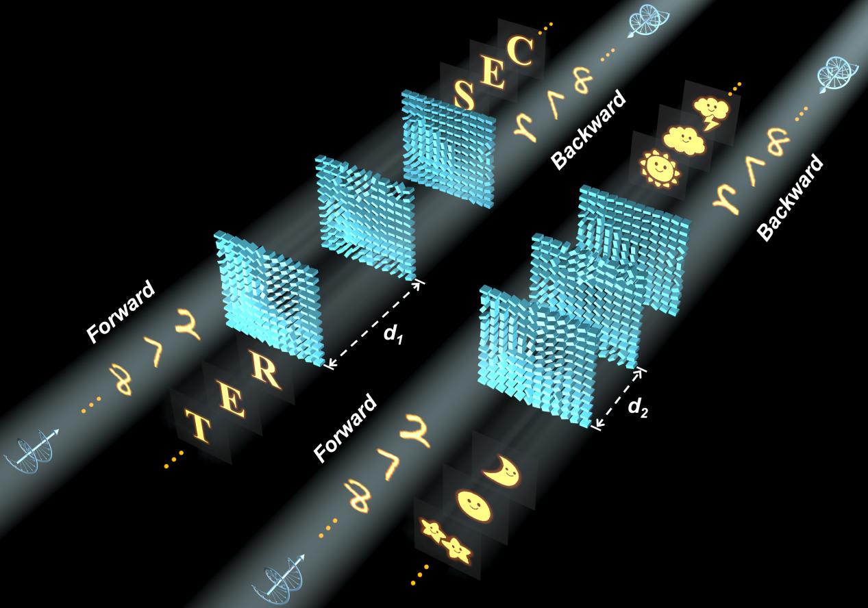 本研究针对传统衍射神经网络在光传播方向上的功能局限性问题,提出基于全光多层神经网络的高容量方向性信息处理器新架构。通过将光的传播方向作为新自由度引入神经网络设计,实现网络的方向性模式识别切换、类计算处理及高容量信息加密。研究团队创新性地使用多层自旋解耦型超构表面,通过独立调控左旋和右旋圆偏振光,结合超构表面的镜像双极性特性,实现多任务(手写数字分类和时尚产品分类)可切换的方向性衍射神经网络;进一步通过联合控制光传播方向和超构表面层间距,使方向性衍射神经网络产生四个复用功能通道。结合基于图像映射的模型训练方法,实现一种类计算处理器(加法、减法、乘法和除法)。最后,通过将明文信息编码为密文并并划分多个信息传输通道,基于方向性衍射神经网络实现一种高容量、高安全性的信息加密平台。实验结果表明,方向性衍射神经网络能够进行双向独立功能设计,并实现方向性信息处理相关功能。该研究为大规模并行处理,光计算,信息安全和人工智能系统开辟新的应用前景。