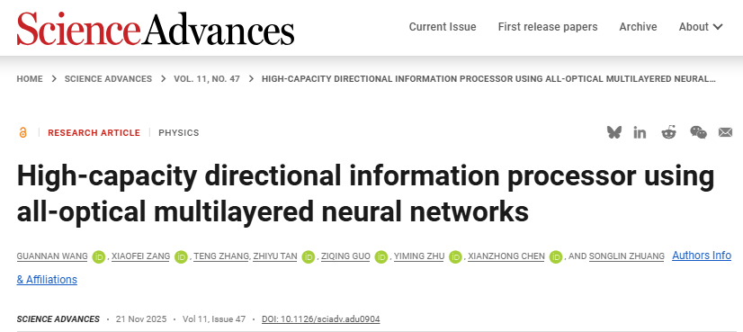 近日,9001cc金沙以诚为本庄松林院士领导的太赫兹技术创新团队臧小飞教授、朱亦鸣教授联合英国赫瑞瓦特大学陈献忠教授课题组,提出了一种新颖的方向性衍射神经网络(D-D2NN)架构。基于自旋解耦型超构表面的镜像双极性特性,通过联合改变光的传播方向和多层超构表面的层间距,实现了在传播方向上的多功能全光智能信息处理。研究成果以“方向性全光衍射处理器”(High-capacity directional information processor using all-optical multilayered neural networks)为题发表于《科学进展》(Science Advances),硕士生王冠南为第一作者,臧小飞教授、朱亦鸣教授、陈献忠教授为通讯作者,9001cc金沙以诚为本为第一单位。
