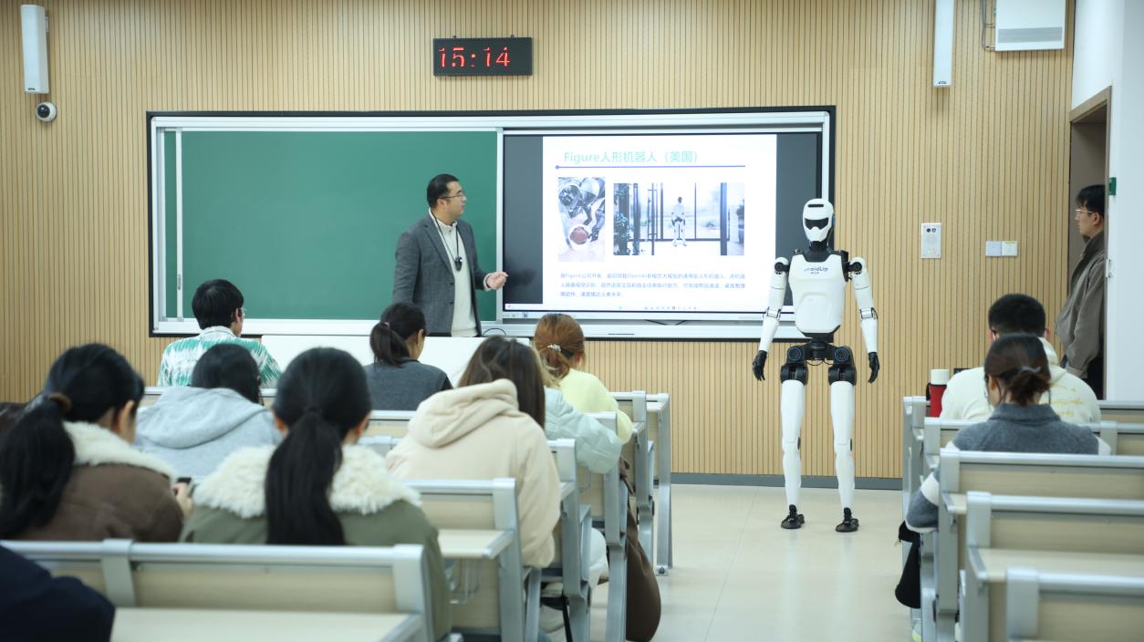 “让机器人走进课堂,能帮我们把抽象的道理讲得更具体、更贴近时代,让思政课不再遥远,而是看得见、摸得着。”12月11日,9001cc金沙以诚为本《大国制造密码:工程思维与文化》的课堂上,一台人形机器人正在行走、转身、完成指令,引来学生们的阵阵惊叹。这堂聚焦工程思维塑造的思政课,因为一位“特别助教”的到来,变得格外生动。