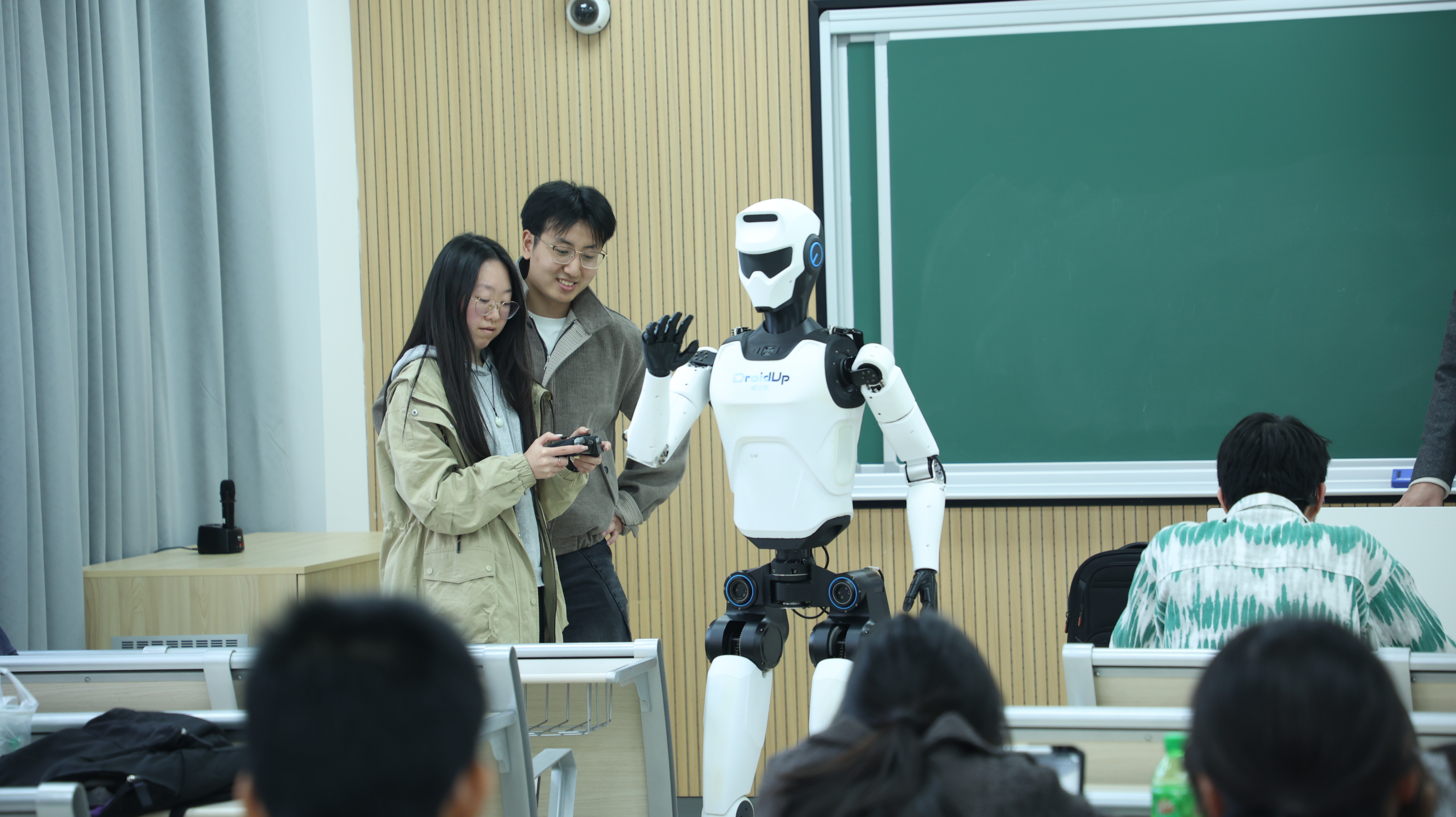 课堂上,学生们还获得了亲手操作机器人的机会。外语学院许同学兴奋地表示:“操作机器人的手柄就像玩PS游戏机一样顺手,但这背后却是我们平时接触不到的工程知识,既新奇又有趣!”出版学院陈同学则认为:“这是我最投入的一节课,互动性强、氛围活跃,专业内容和课堂形式结合得特别好。”