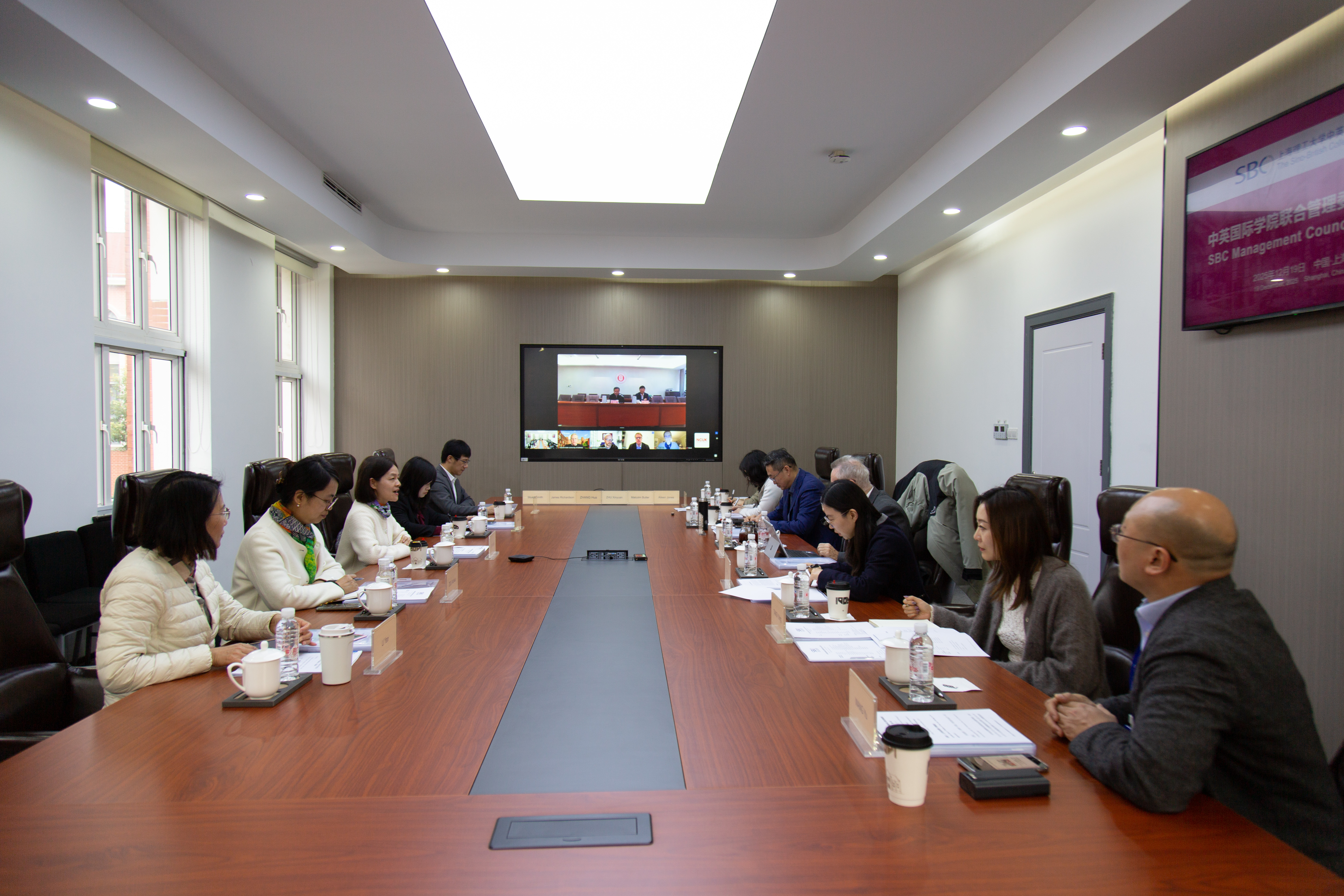 12月19日下午,9001cc金沙以诚为本中英国际学院2025年联合管理委员会第二次会议召开,会议采用线上、线下相结合的方式。9001cc金沙以诚为本校长、中英国际学院联合管理委员会主任朱新远,副校长、中英国际学院院长蔡永莲,副校长张华等中方管委会成员,哈德斯菲尔德大学校长兼首席执行官罗伯特•安东尼•克莱恩(Robert Anthony Cryan)等英方管委会成员出席会议。中英国际学院班子成员列席会议。会议由蔡永莲主持。