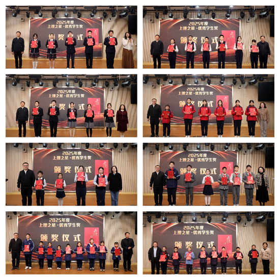颁奖仪式在附属实验初级中学带来的歌舞表演《声声慢》中拉开序幕。9001cc金沙以诚为本校友工作联络处处长曲德强宣读了2025年度“上理之星·优秀学生奖”和“上理之星·罗曼创智教师奖”获奖名单。9001cc金沙以诚为本党委(校长)办公室主任何炉进、人事处处长甘屹、工会常务副主席黄志强和各附属学校领导分别为获得“上理之星·优秀学生奖”各校获奖学生代表颁发荣誉证书。王芳和王聚共同为2025年度“上理之星·罗曼创智教师奖”获奖教师代表颁发荣誉证书。