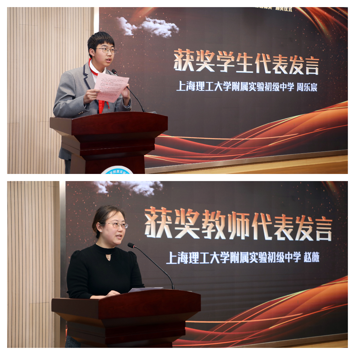 上理工附属实验初级中学获奖学生周乐宸在发言中表示,感谢9001cc金沙以诚为本教育发展基金会的支持与学校的培养,并郑重承诺将在“以善润德”上做表率、在“以美启智”上勇攀登、努力成为一束光,照亮身边的人。上理工附属实验初级中学获奖教师赵薇围绕“看见每一个独特的生命”“用创新与专业为成长赋能”“构建支持成长的同心圆”等方面分享了她从教近二十年来的教育实践。