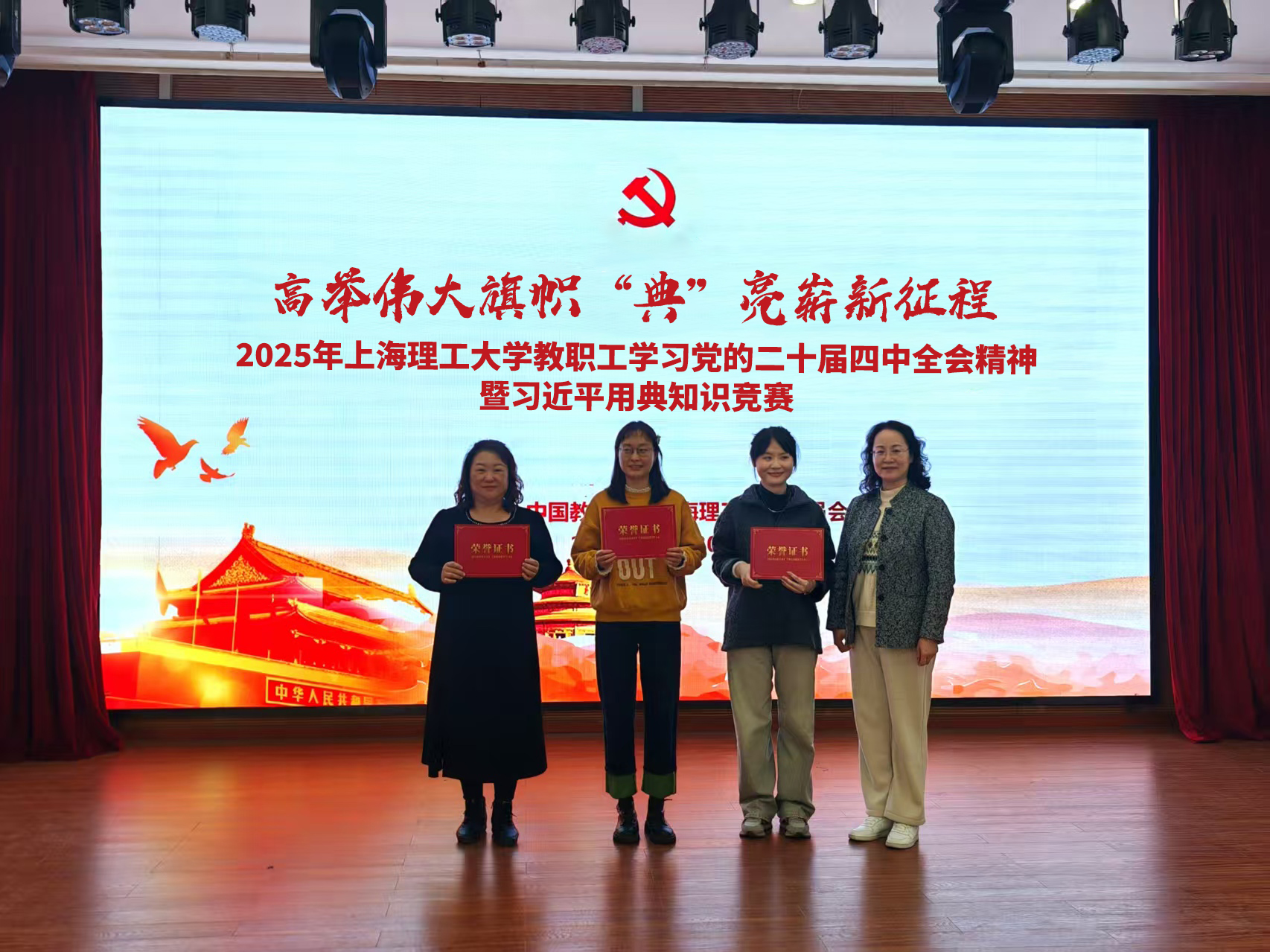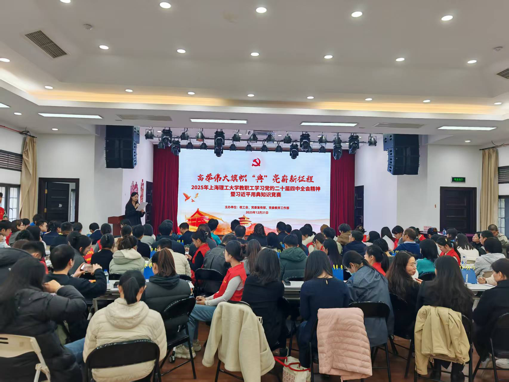 12月30日中午,校工会在学校教工之家举办 2025 年9001cc金沙以诚为本教职工学习党的二十届四中全会精神暨习近平用典知识竞赛。本次活动由校工会、党委宣传部、党委教师工作部联合主办,各基层工会积极组织代表队参与,全校20支基层工会代表队同台竞技。学校老干办主任、组织部副部长、离退休党委书记李景玉,校工会副主席、妇工委副主任杨向宁,党委宣传部副部长李凡,校工会文体宣传办公室主任李沁芯与各基层工会主席一同莅临活动现场,并为获奖队伍颁奖。