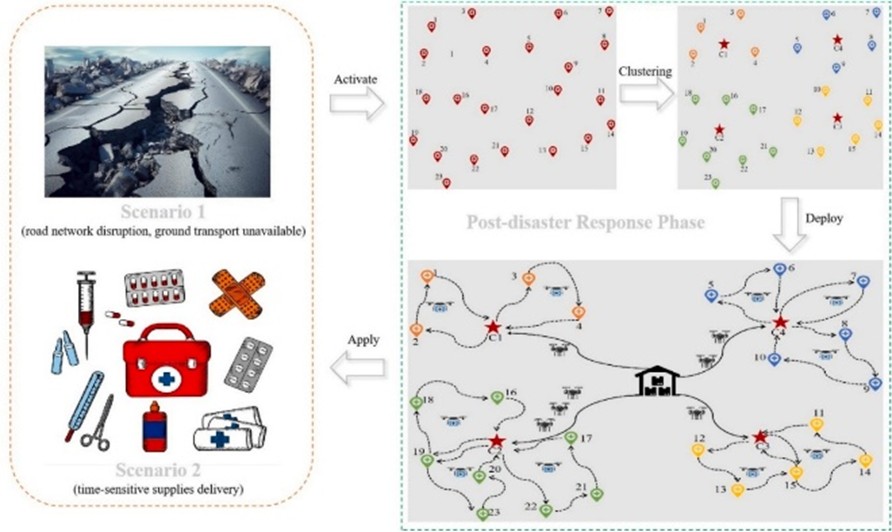 在灾后恢复阶段,研究团队聚焦于道路系统受损、地面交通受阻条件下的人道主义物资可持续配送难题,构建了一套“母机-子机”协同无人机配送体系及其两阶段分布鲁棒优化模型。该研究通过集成K-means聚类选址算法、多目标路径规划与基于矩信息的鲁棒优化方法,形成了兼顾恢复效率、资源约束与不确定性的集成决策框架,显著提升了大规模灾区恢复期物流调度的计算可解性与方案可行性。