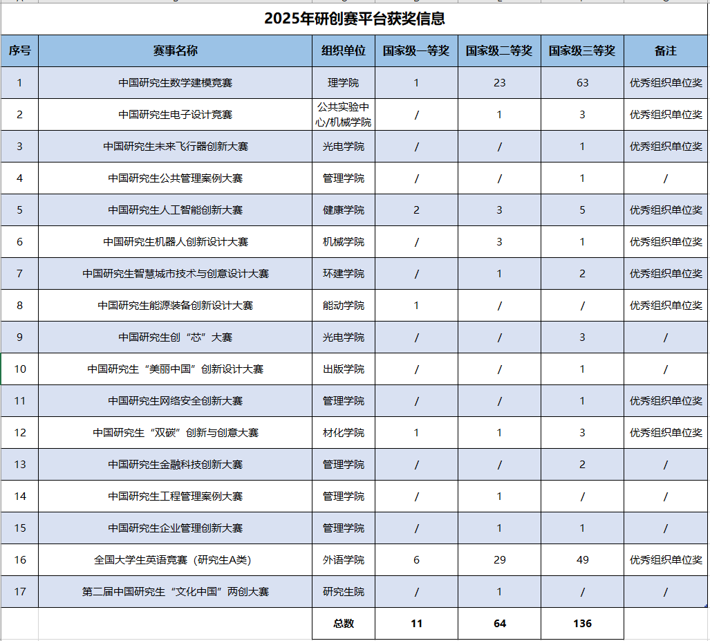 其中,理学院承办的2025年“华为杯”第二十二届中国研究生数学建模竞赛,上理工共1341支队伍参赛,最终获一等奖1项、二等奖23项、三等奖63项,上理工获“优秀组织单位”和“先进个人”荣誉,并以得分第一位居“优秀组织单位”榜首。能动学院、光电学院、管理学院、公共实验中心/机械学院、外语学院、环建学院、健康学院、理学院、材化学院等承办的10个主题赛事获“优秀组织单位”奖。其中,中国研究生智慧城市技术与创意设计大赛和中国研究生网络安全创新大赛首次获得“优秀组织单位奖”。中国研究生未来飞行器创新大赛、中国研究生公共管理案例大赛、中国研究生金融科技创新大赛、中国研究生“文化中国”两创大赛等4个平台实现了国奖零的突破。中国研究生人工智能创新大赛、中国研究生能源装备创新设计大赛、中国研究生“双碳”创新与创意大赛等3个平台实现了国家级一等奖的突破。此外,在2025年全国大学生英语竞赛中,金沙官网研究生获国家级一等奖6人、二等奖29人、三等奖49人。