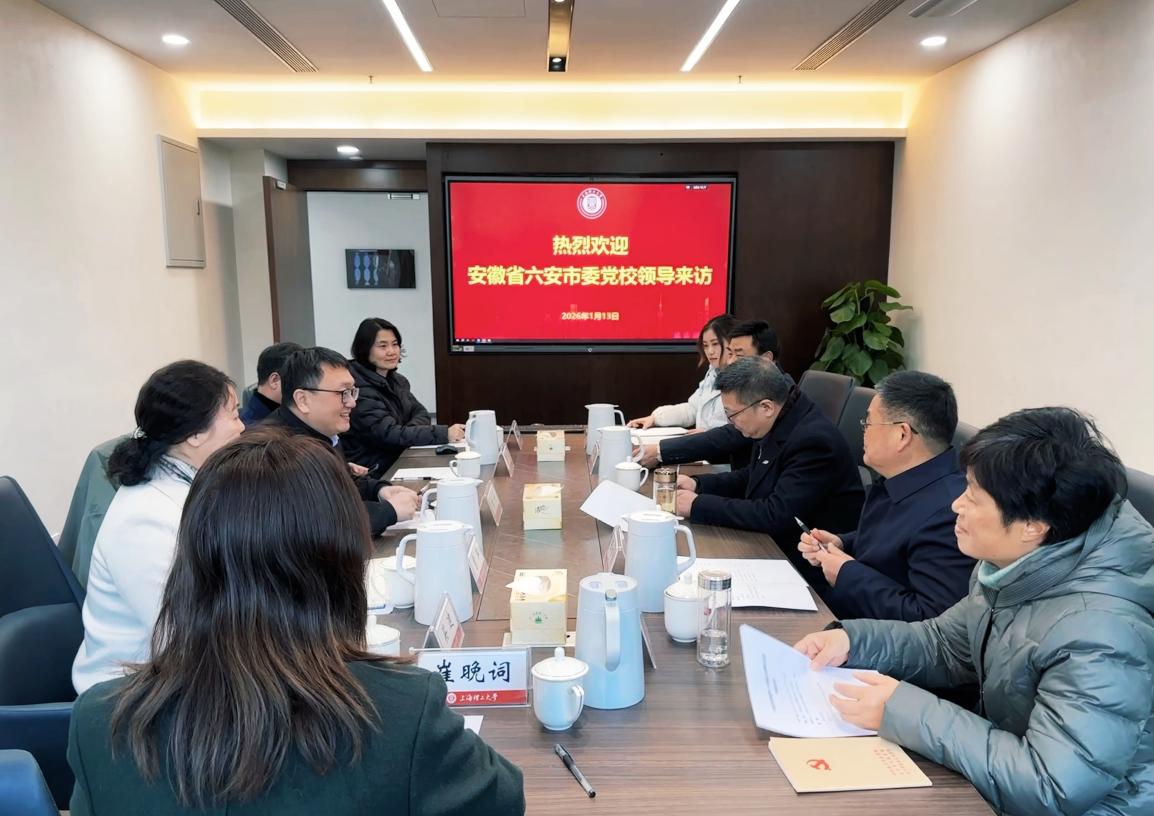 为深化校地对口合作、推进新时代上海市高校教师国情教育基地(以下简称“国情教育基地”)建设,1月13日上午,安徽省六安市委党校副校长汪明勇一行来访9001cc金沙以诚为本。校党委副书记贺莉亲切会见来宾,党委教师工作部、组织部和马克思主义学院等相关负责人陪同会见并参加座谈会。