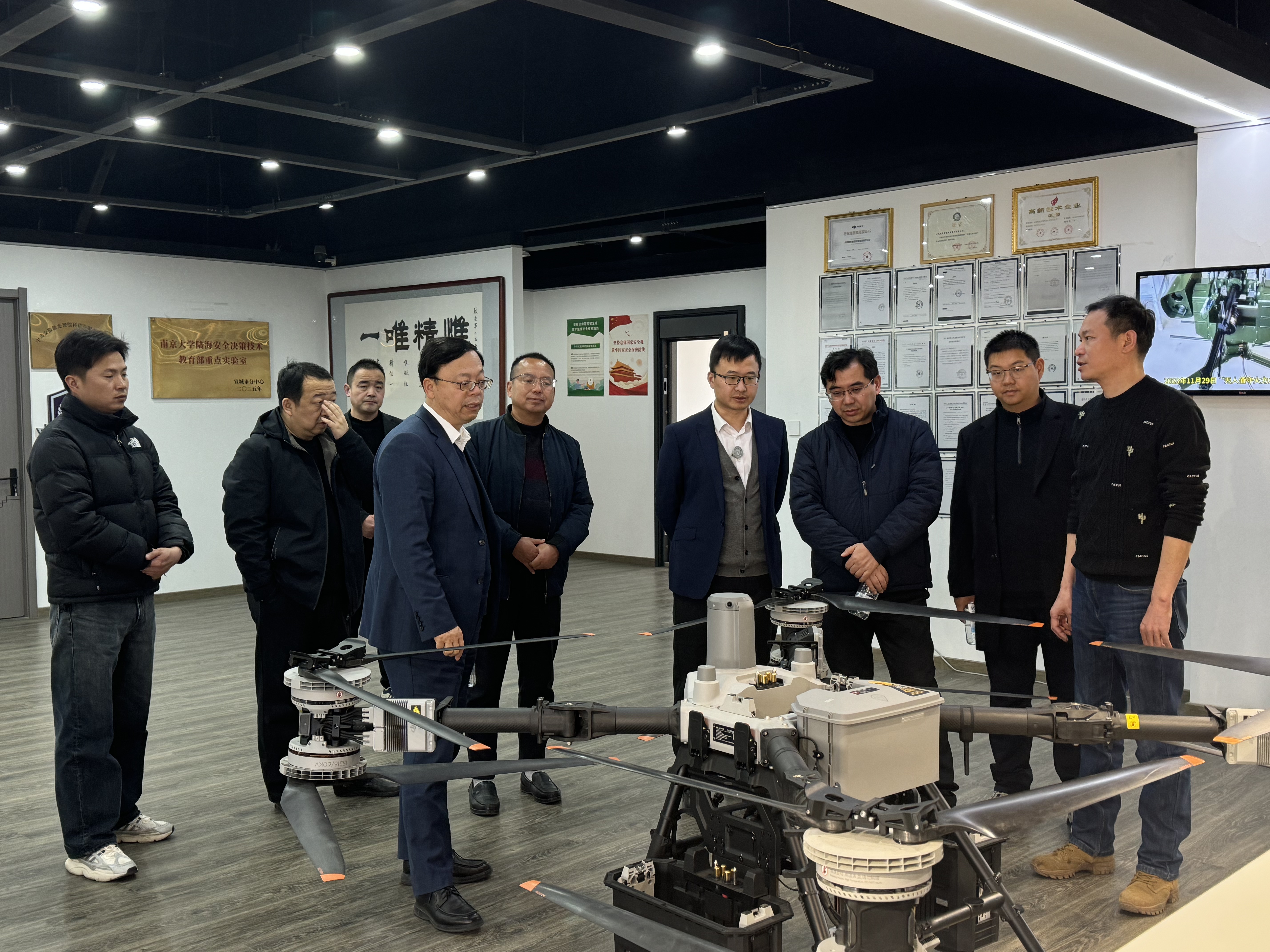 会后,双方共同调研了“应急方格”项目及安徽徽光智能科技有限责任公司。江政义等向智慧应急管理学院一行详细介绍了宣城市应急管理局在无人机应急救援领域的前沿探索,并现场演示了“应急方格”项目的应急中继通信与物资投送能力。安徽徽光智能科技有限责任公司CEO裴忠军就公司在无人装备、低空经济、城市管理等方向的产品布局与技术创新进行了系统阐述。智慧应急管理学院和安徽徽光智能科技有限责任公司围绕人才培养合作、科研项目共研等议题进行了深入交流与研讨。
