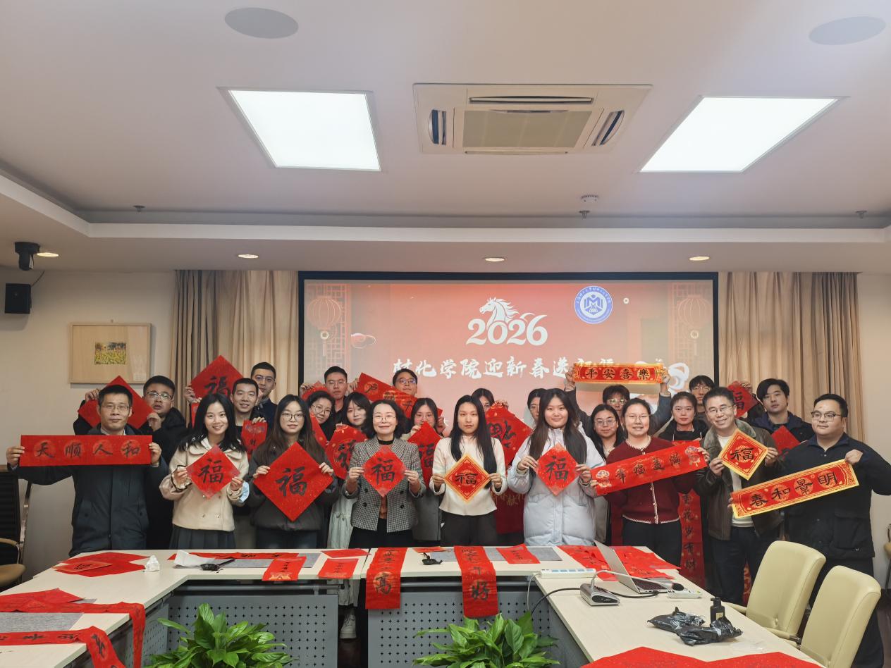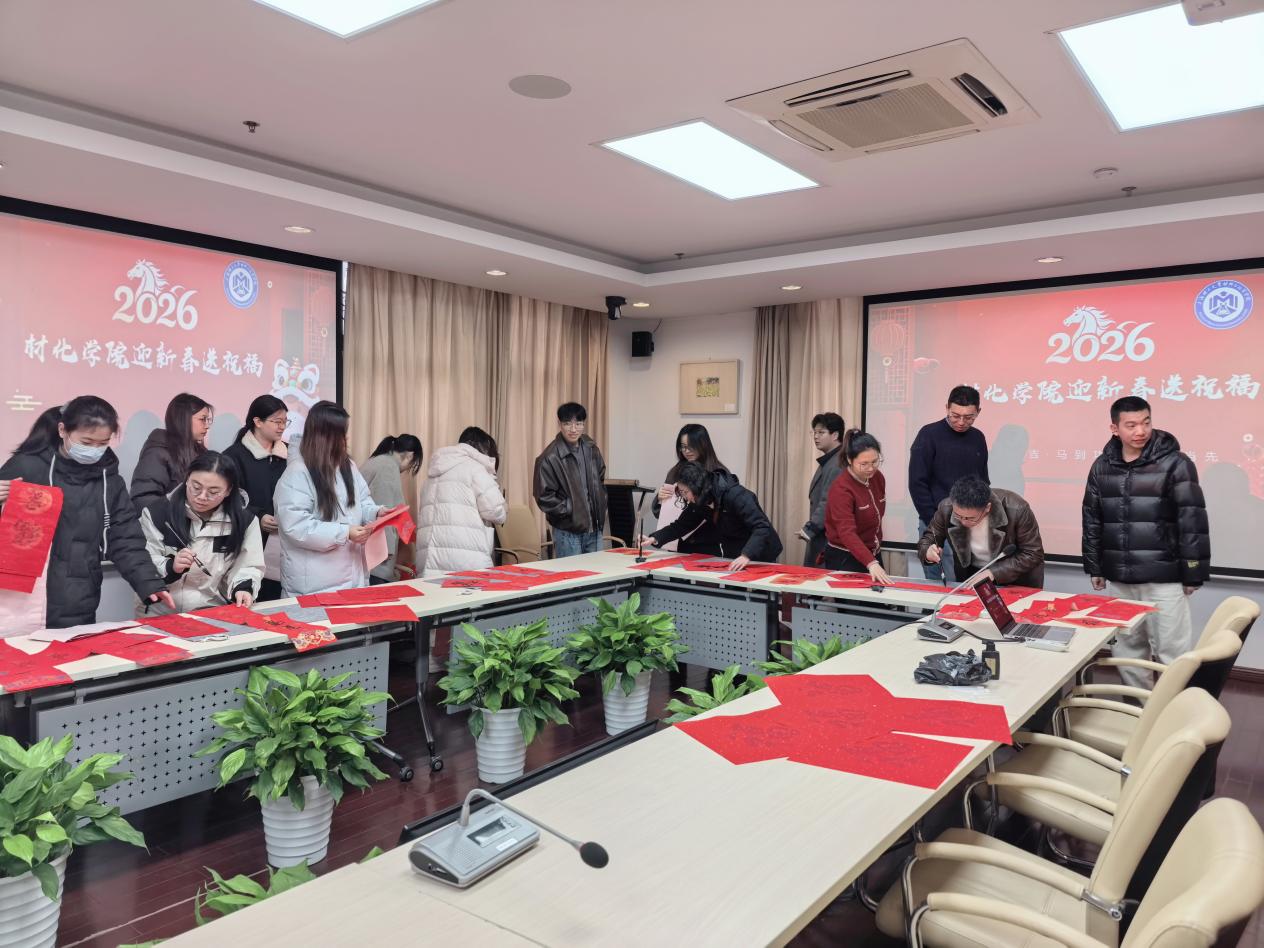 老师们与学生代表齐聚一堂,红纸铺展、墨汁飘香,书写新春对联。师生共同将对新年的美好期许融入笔端,一幅幅饱含祝福的春联、一个个喜庆红火的“福”字跃然纸上。“天顺人和”“春和景明”“幸福美满”等寓意吉祥的词句,传递着学院对师生的新春祝福,现场洋溢着浓浓的年味。