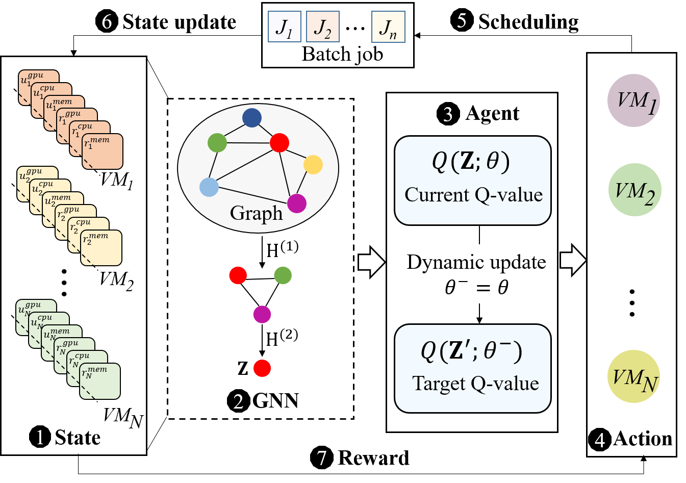 模型通过融合图神经网络捕捉虚拟机节点间复杂的资源依赖关系,构建集群全局状态表征;针对传统双重深度Q网络目标网络更新滞后的问题,引入负载感知的动态更新机制,显著提升模型对异构资源环境变化的响应速度。最终构建了兼顾负载均衡、作业延迟与调度公平性的多目标优化框架,为异构GPU集群的高效治理提供了系统性解决方案。研究成果不仅丰富了云计算资源调度的理论体系,也为构建下一代高效、自治的数据中心调度系统提供了重要的技术范式与管理启示。