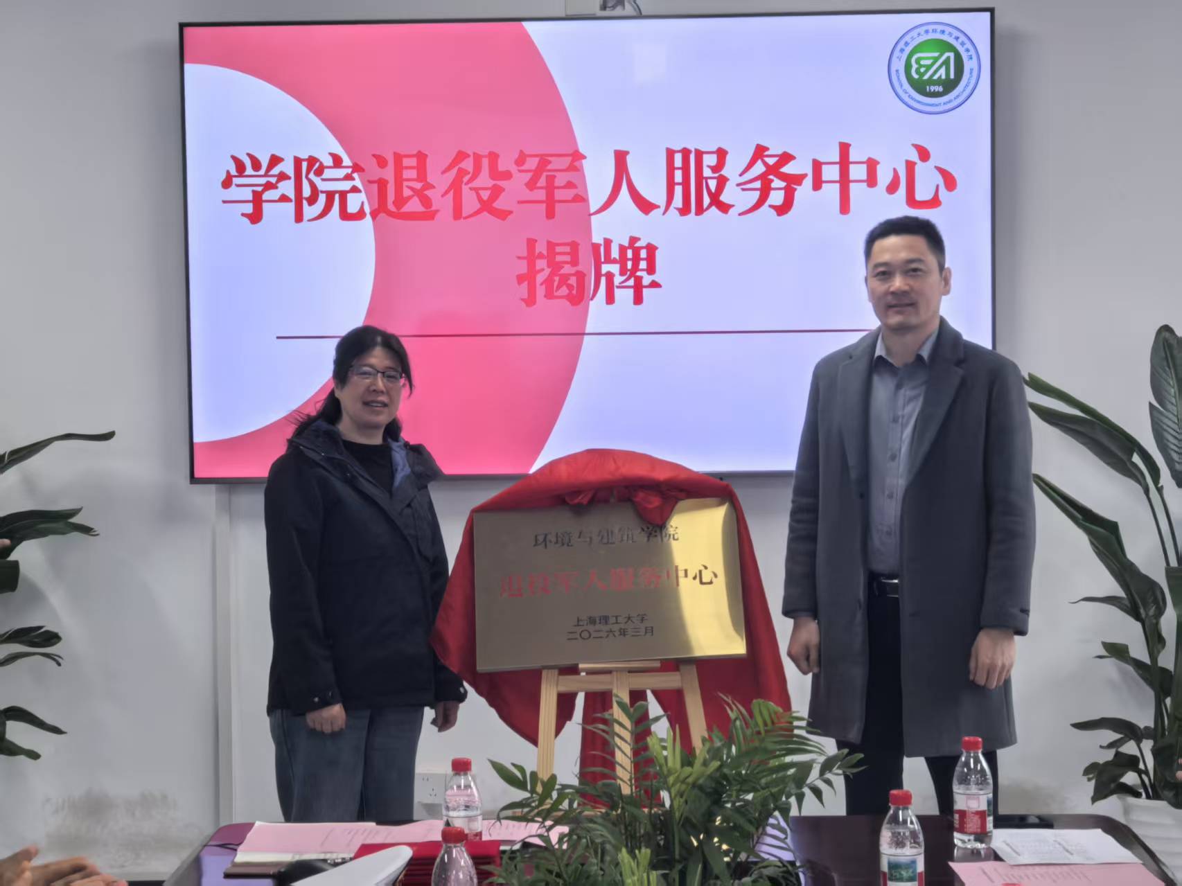 卢萧与曹桂馥共同为环境与建筑学院退役大学生服务中心揭牌。未来,该中心将提供政策咨询、学业辅导、心理疏导、就业推荐等“一站式”服务,打造退役学生的“温暖之家”。为进一步强化服务中心职能,朱垌烨为服务中心负责人颁发了聘书。